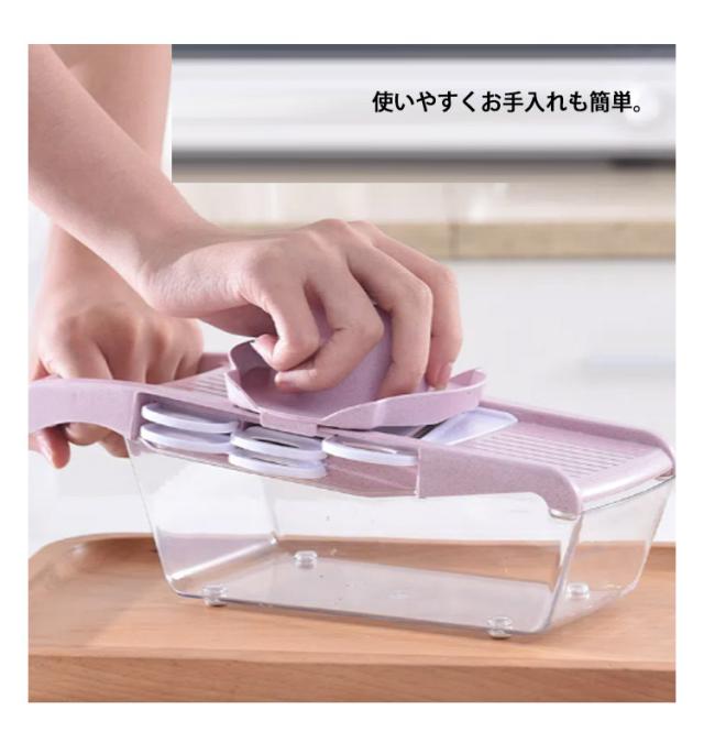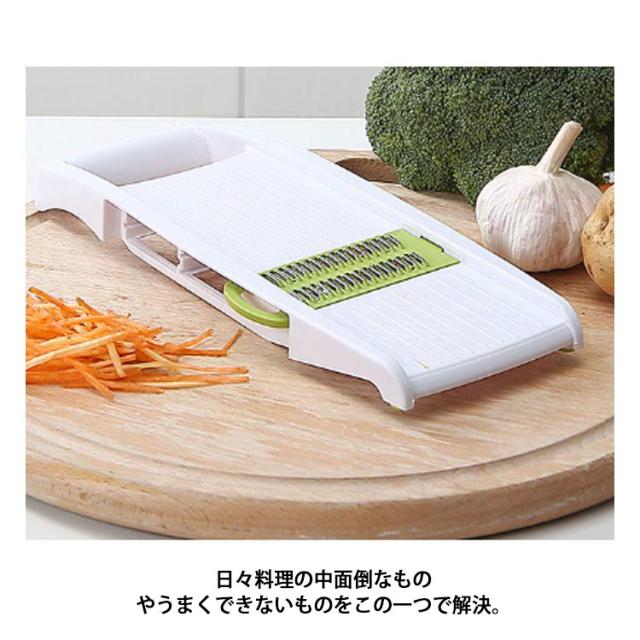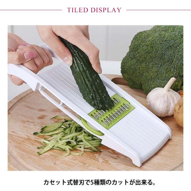 | 薄切り・千切り・ツマ切り・おろしの和食に欠かせない調理器セット♪ カセット式替刃で5種類のカットが出来る。 日々料理の中面倒なものやうまくできないものをこの一つで解決。 使いやすくお手入れも簡単。 | |
