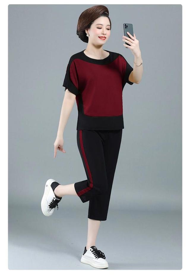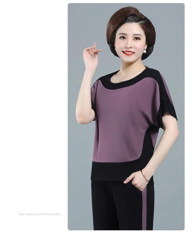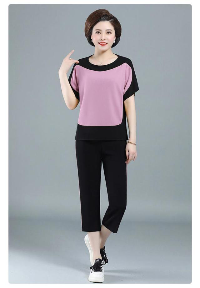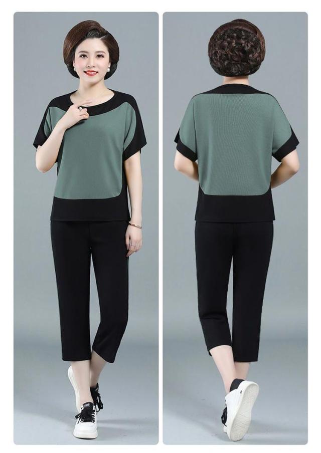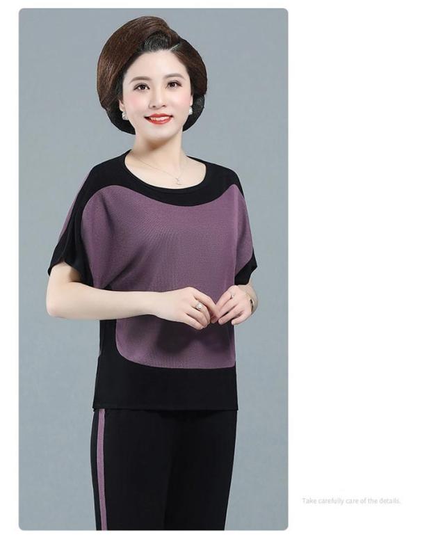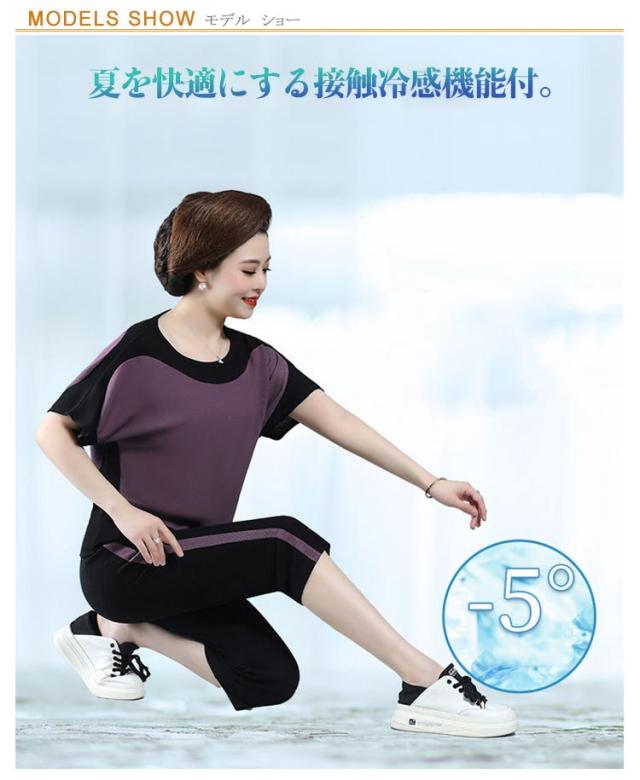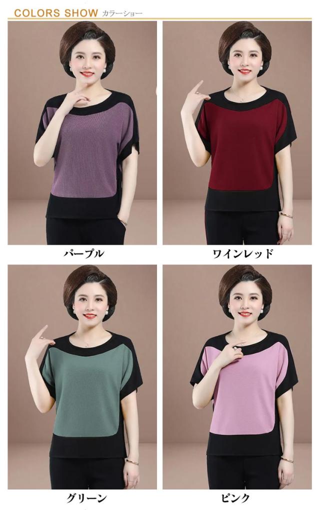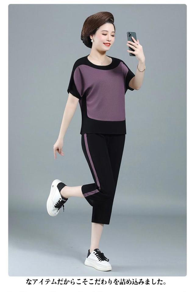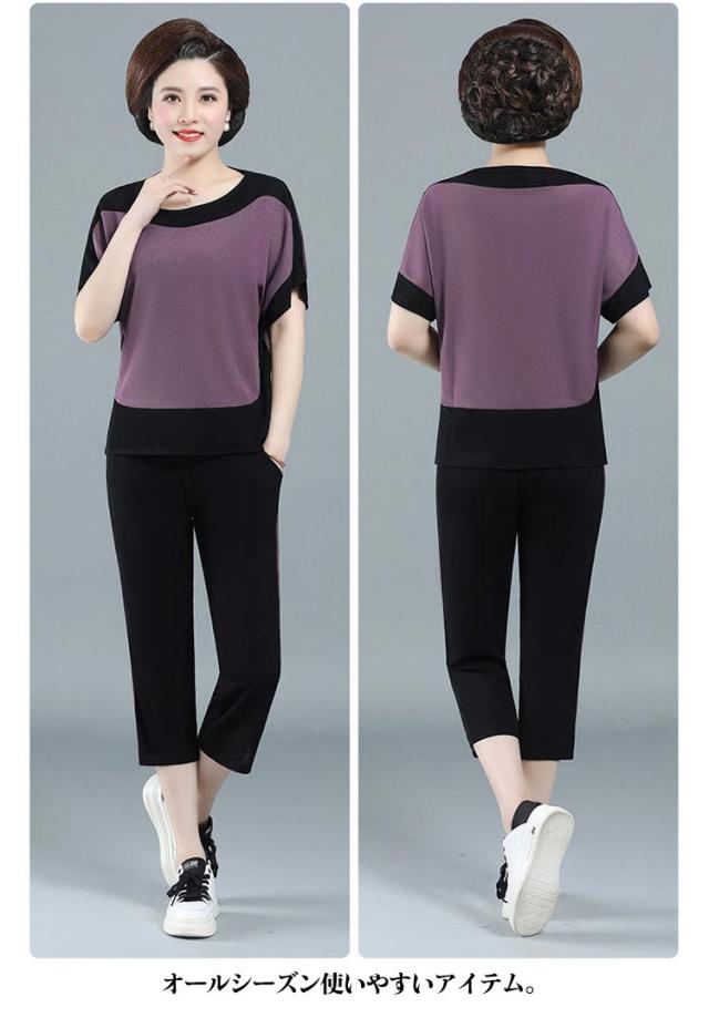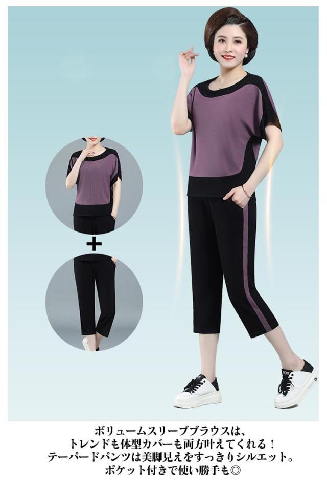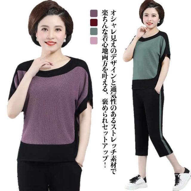配色 散歩 7分丈 薄手 ブラウス パンツ 秋 プルオーバー ニット生地 ニットブラウス 春 半袖 ストレンチ ひんやり 涼しい 夏 母 セットアップ 敬老の日 ママ 運動 ゆったり 30代 40代 50代