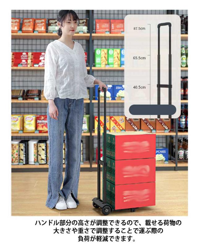 | 車に積めるコンパクトタイプ!便利な折りたたみキャリーカートが新登場。 ハンドル部分の高さが調整できるので、載せる荷物の大きさや重さで調整することで運ぶ際の負荷が軽減できます。 ゴムコードをご用意しました。これで大きい荷物もしっかり固定できます♪ 台車底部の形状をフラット&ワイドにすることで自立が可能に。 クーラーボックスや灯油タンク、雑誌・新聞を一度運ぶなど重たい荷物をラクラク移動できます。 キャスターが付いているのでコロコロ転がして荷物を運べちゃいます♪ 使用しない時は折り畳めるので場所もとりません! | |