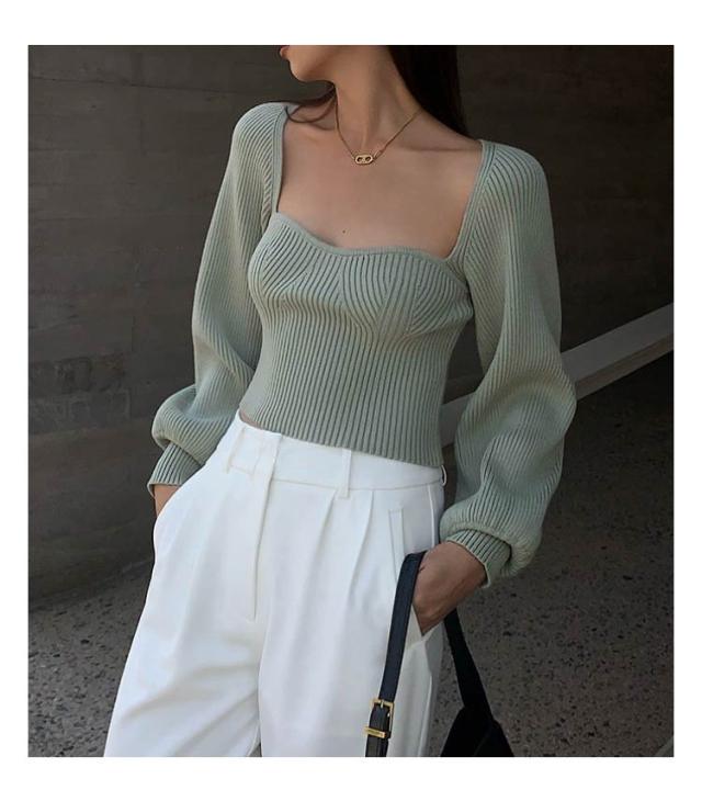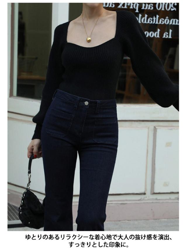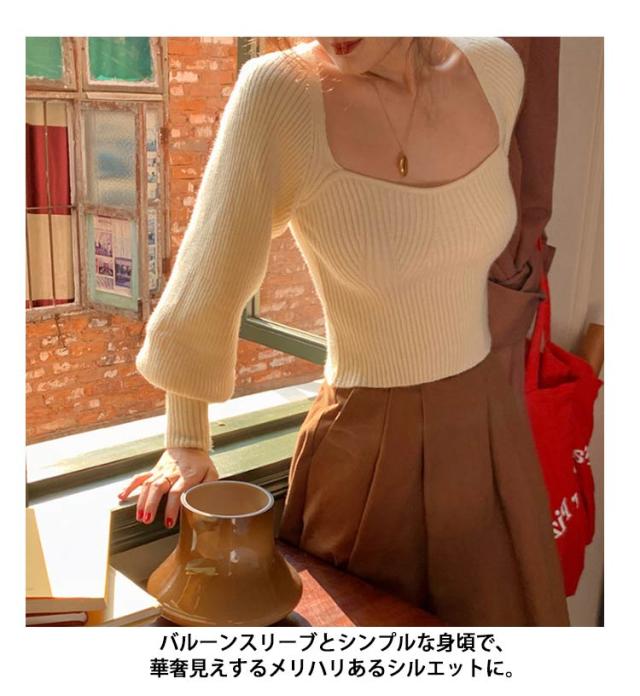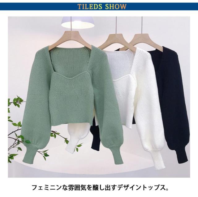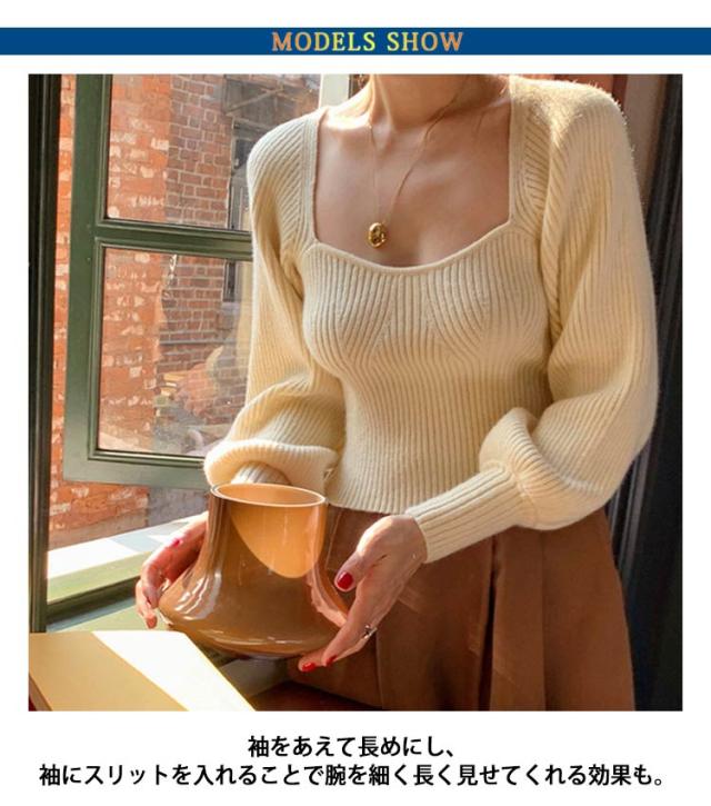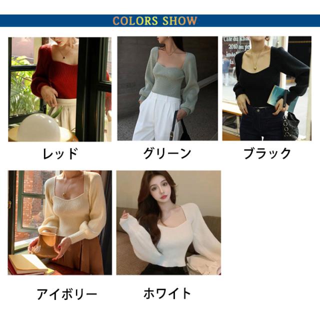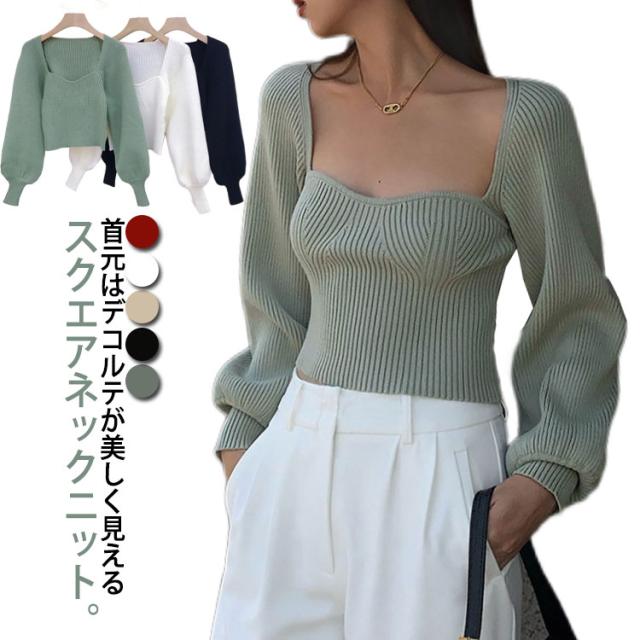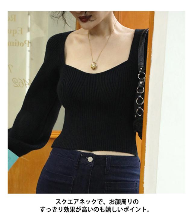 プルオーバー スクエアネック パフスリーブ ニット ブラック レディース トップス 長袖 ボリュームスリーブ リブニット セーター フェミニン セクシー シンプル スリム きれいめ 大人可愛い オフィス レッド グリーン トップス