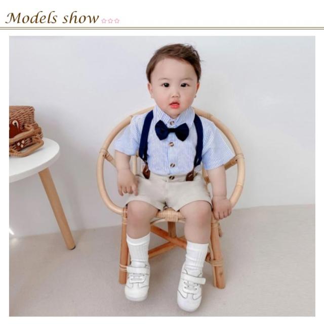 | お子様の晴れ舞台に大活躍間違いなしの男の子フォーマルウェア! 肌触りと着心地のよい素材を使って、柔らかくて肌を守ります。 4点セット内容:半袖シャツ+蝶ネクタイ+半ズボン+サスペンダー サスペンダーでパンツが安定するので、元気な男の子にも安心。 発表会、入学式、卒業式、七五三、お宮参り、冠婚葬祭、初節句に撮影用など色々なシーンで活躍してくれます。 | |