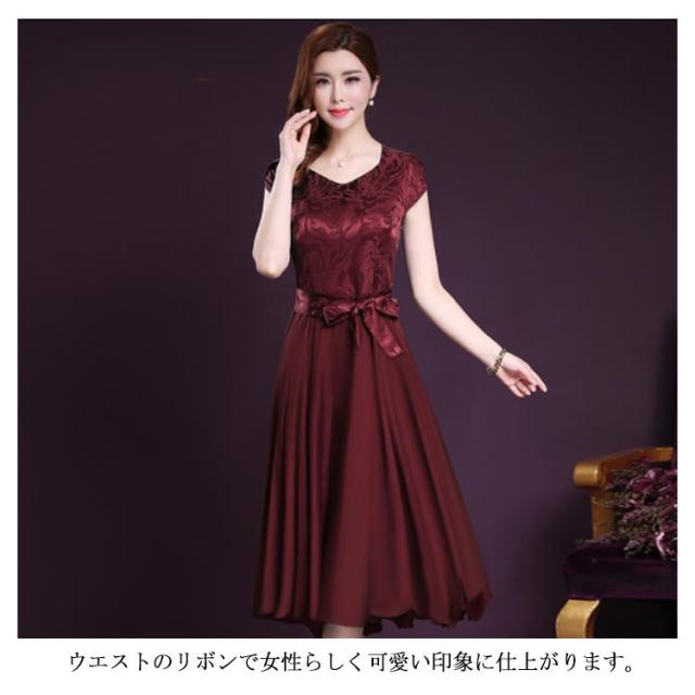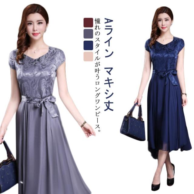 レディース マキシ丈 ロング丈 フレンチスリーブ ワンピース ドレス フレア Aライン パーティー Vネック ベルト付フレンチスリーブワンピース