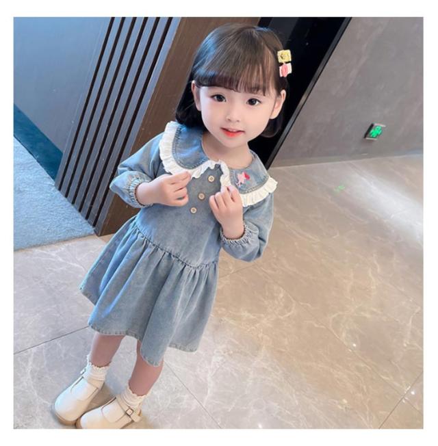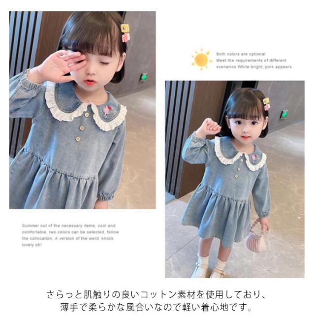 子供服 ガールズ ベビー服 シャツワンピース デニム デニムワンピース ワンピース 膝丈 春服 秋服 長袖 子ども服 キッズ 定番 女児 フレア Aライン おしゃれ かわいい 襟付きワンピース 前ボタン 女の子 カジュアル キュート 日常 セーラー服