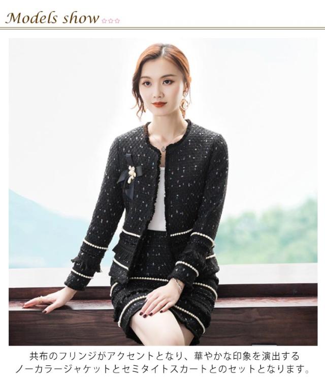 ノーカラージャケット レディース ツイード素材 フォーマル ミニ丈 タイトスカート 上下セット ショート丈 ミニスカート フリンジ 裏地付き 長袖 入学式 卒業式 参観日 七五三 結婚式 お呼ばれ 食事会 着痩せ スカートスーツ