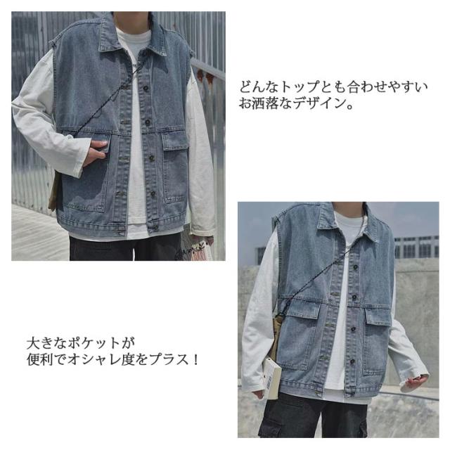 ゆったり ベスト 袖なし デニムベスト ノースリーブ ジャケット デニム メンズ 前開き オーバーサイズ 重ね着 デニムジャケット トップス 前開き ポケット付き ウォッシュ加工 お洒落 カジュアル ヴィンテージ BF風 ストリート 春 レイヤード