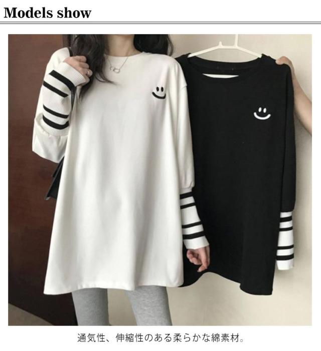 レディース Tシャツ 切り替え袖 ビッグTシャツ 送料無料 カットソー 春 大人 プルオーバー ロングTシャツ ロンT プルオーバー スマイル柄 綿 トップス 女性 カジュアル 夏 秋 薄手 M L 長袖