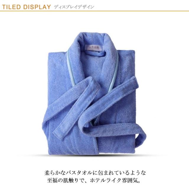 | お風呂上りにさっと羽織れる便利なバスローブ。 柔らかなバスタオルに包まれているような至福の肌触りで、ホテルライク雰囲気。 吸水速乾性に優れたコットンのタオル生地を使用。 吸水性・放湿性に優れており、お風呂上がりでも水滴がポタポタとたれる心配がありません。 さり気ないパイピングでオシャレ感を高めました。 ユニセックスデザインなので男女ペアで着用できます。 | |
