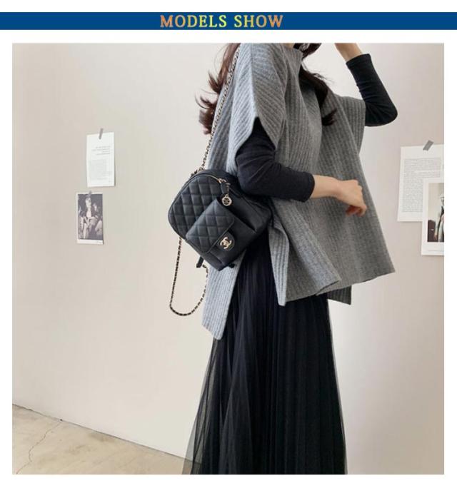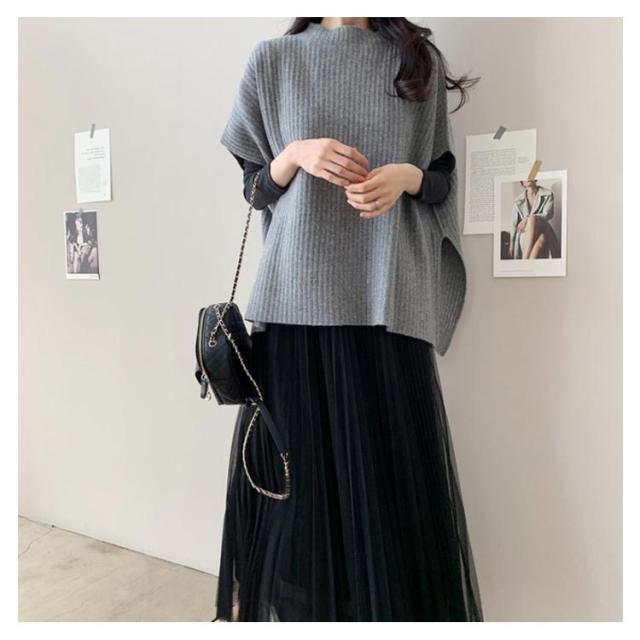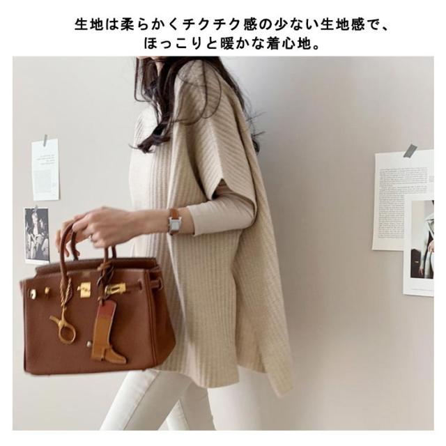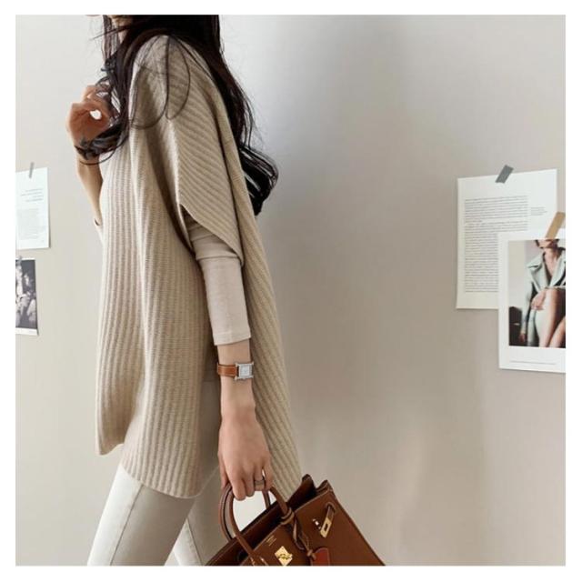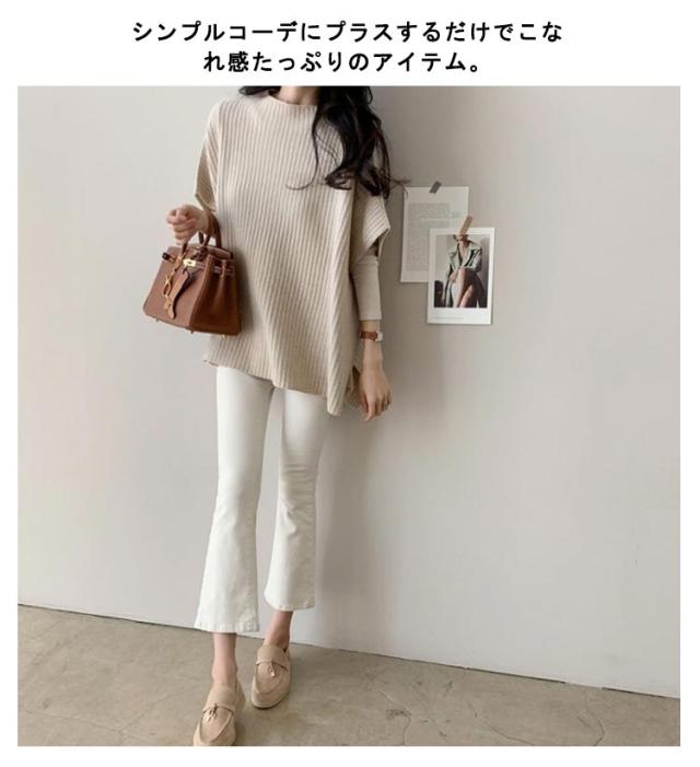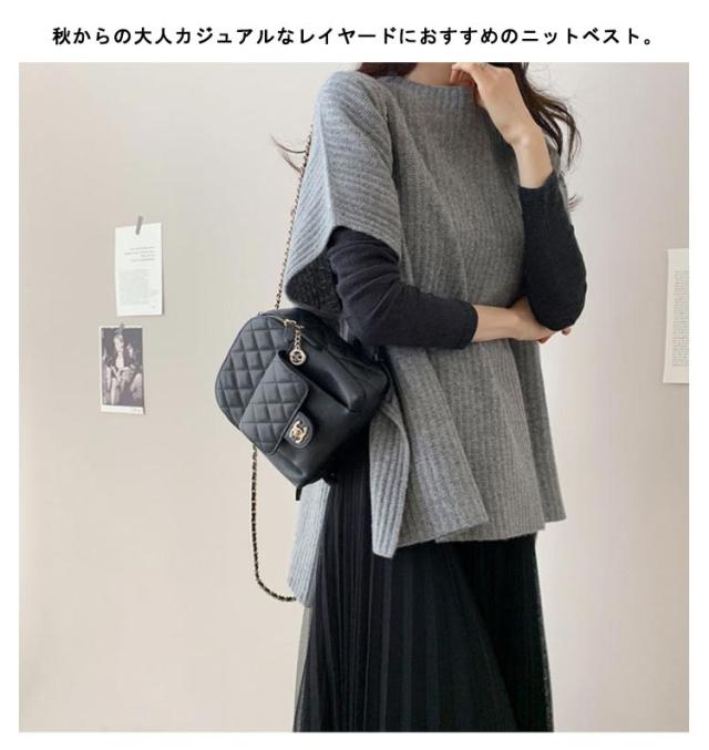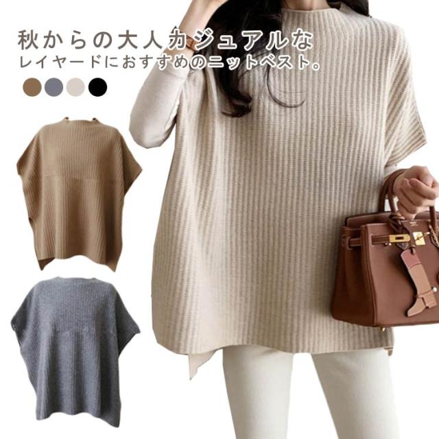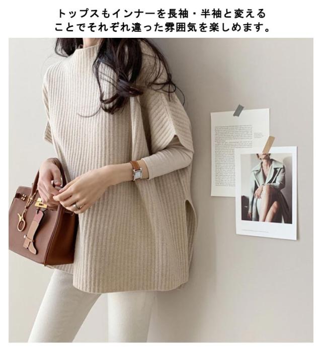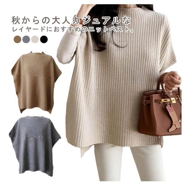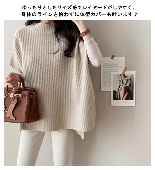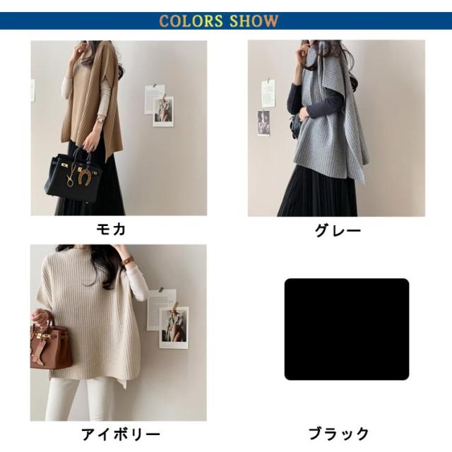 ラウンドネック ケープ 無地 スリット ニットベスト 半袖 ポンチョ ドルマン 五分袖 トップス レイヤード チャンキーニット 重ね着 ローゲージニット プルオーバー リブ 柔らか 通勤 通学 お洒落 レディース