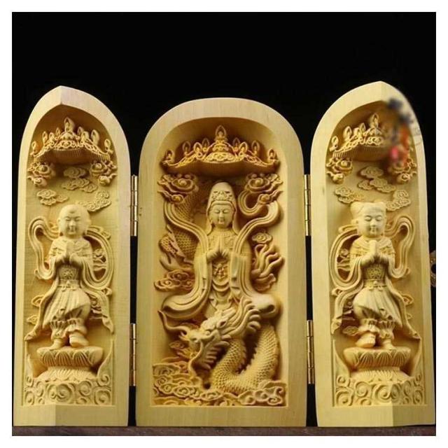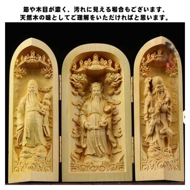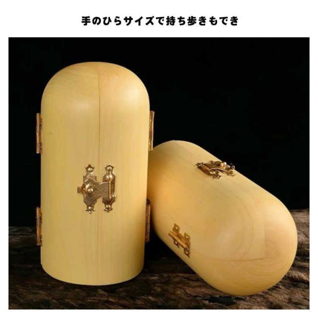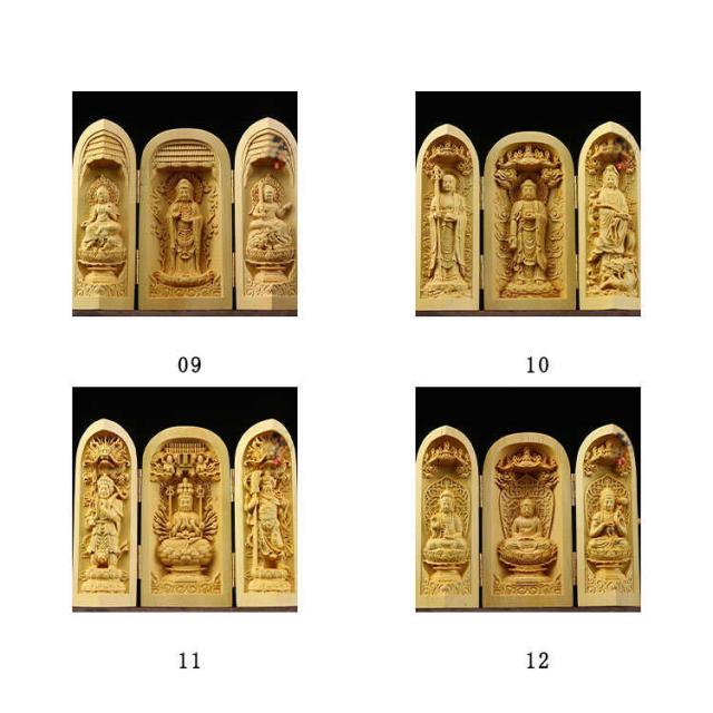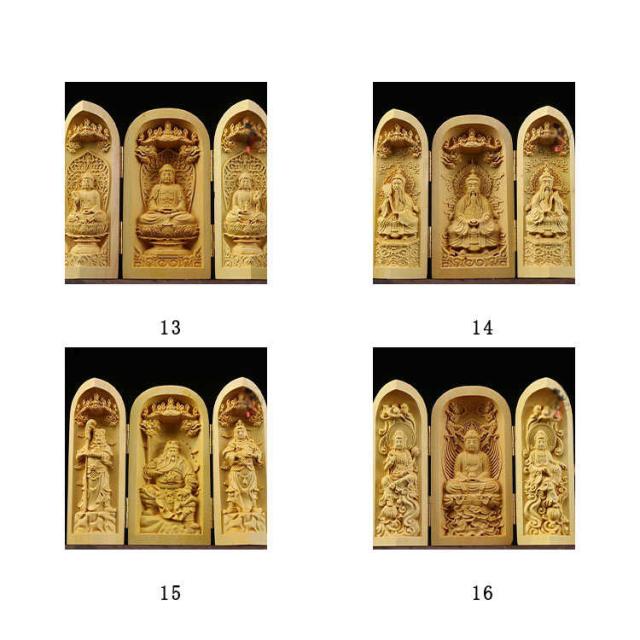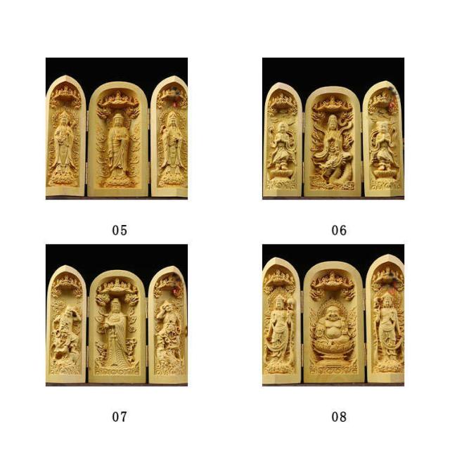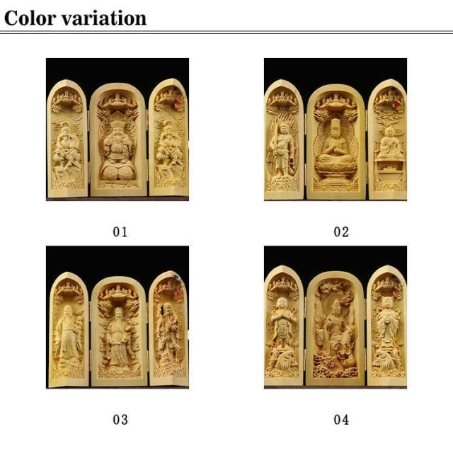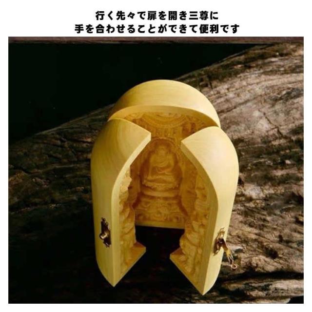 | 手のひらサイズで持ち歩きもでき 行く先々で扉を開き三尊に手を合わせることができて便利です 机や棚などに簡単に設置でき、自分用の仏様としてお祀りできます ※天然木使用のため、それぞれ違った風合いを持ち 木目や色が様々です。 節や木目が濃く、汚れに見える場合もございます、 天然木の味としてご理解をいただければと思います。 | |