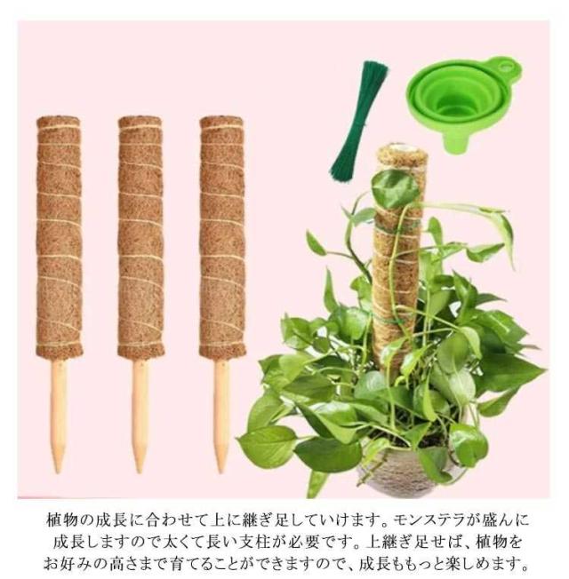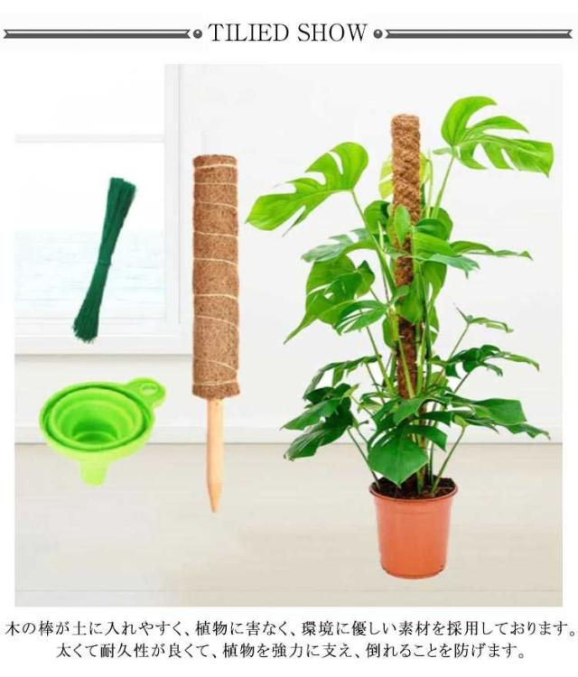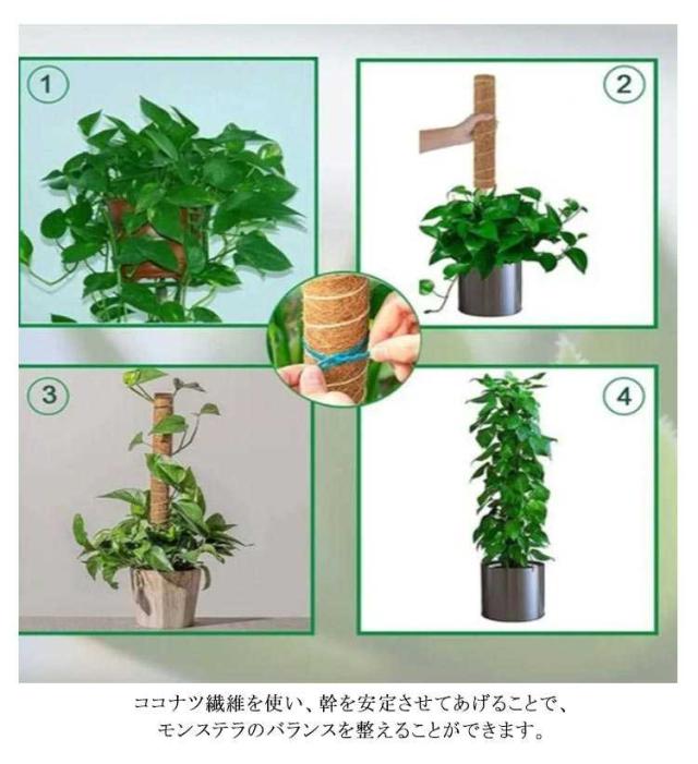 | 天然のココナツ繊維が原材料になり、自然になじみやすくて見栄えが良いです。 木の棒が土に入れやすく、植物に害なく、環境に優しい素材を採用しております。太くて耐久性が良くて、植物を強力に支え、倒れることを防げます。 植物の成長に合わせて上に継ぎ足していけます。モンステラが盛んに成長しますので太くて長い支柱が必要です。上継ぎ足せば、植物をお好みの高さまで育てることができますので、成長ももっと楽しめます。 繊維部に植物が巻き付きやすくなりますので水分も吸収しやすくなります。ココナツ繊維を使い、幹を安定させてあげることで、モンステラのバランスを整えることができます。バランスがよくなれば、葉が密集することが防げるので日当たりや風通し、また害虫予防の効果まで得られますし、株の異常にも早く気付くこともできます。 | |
