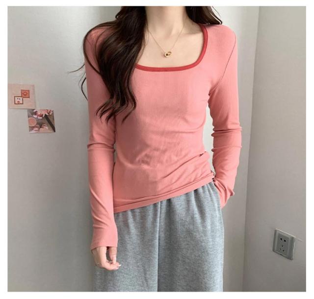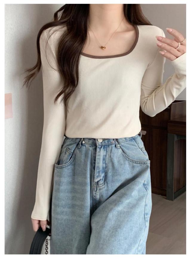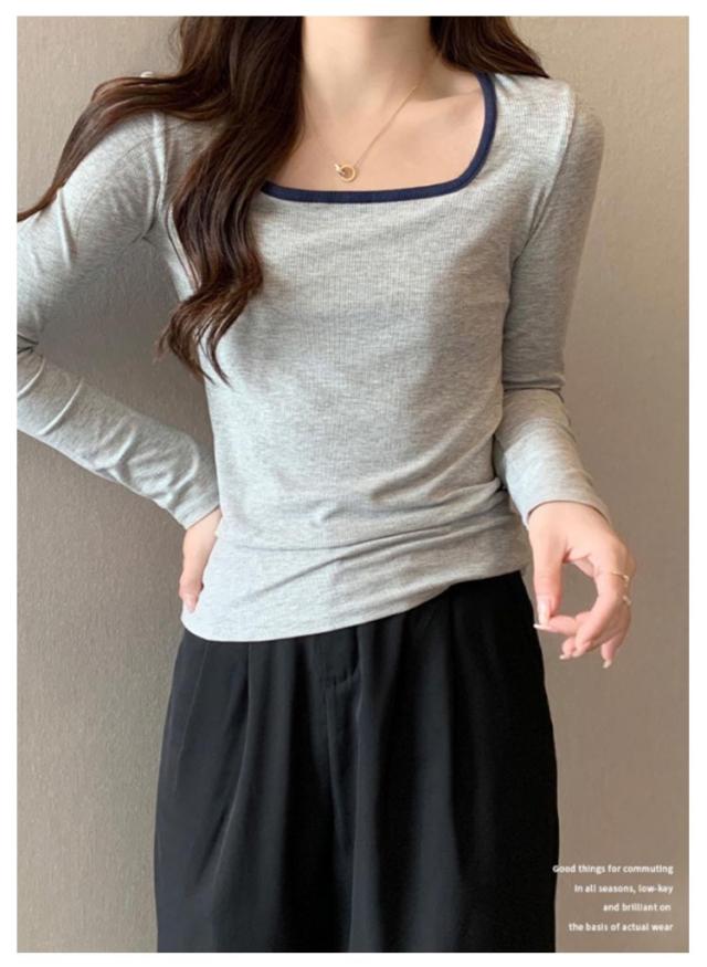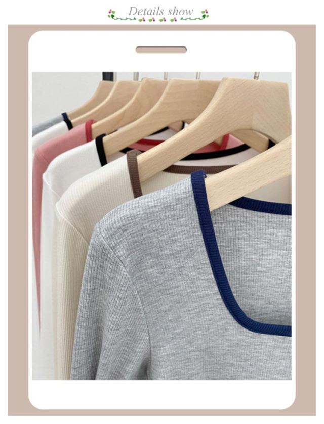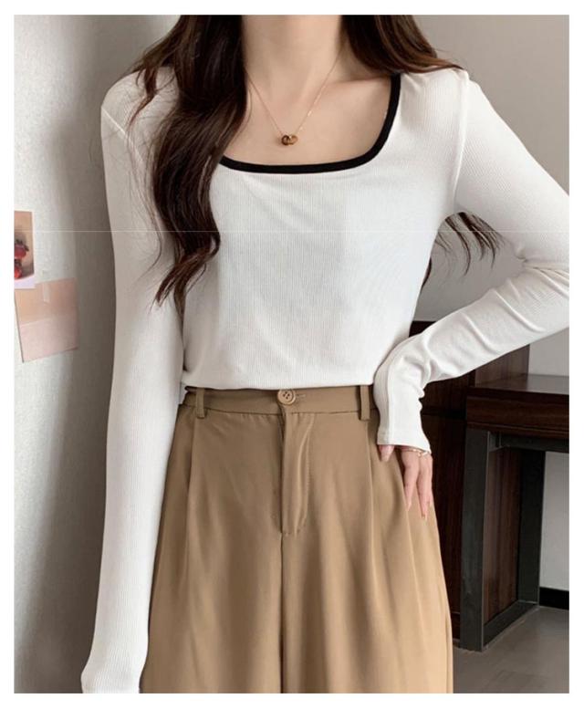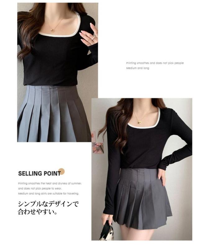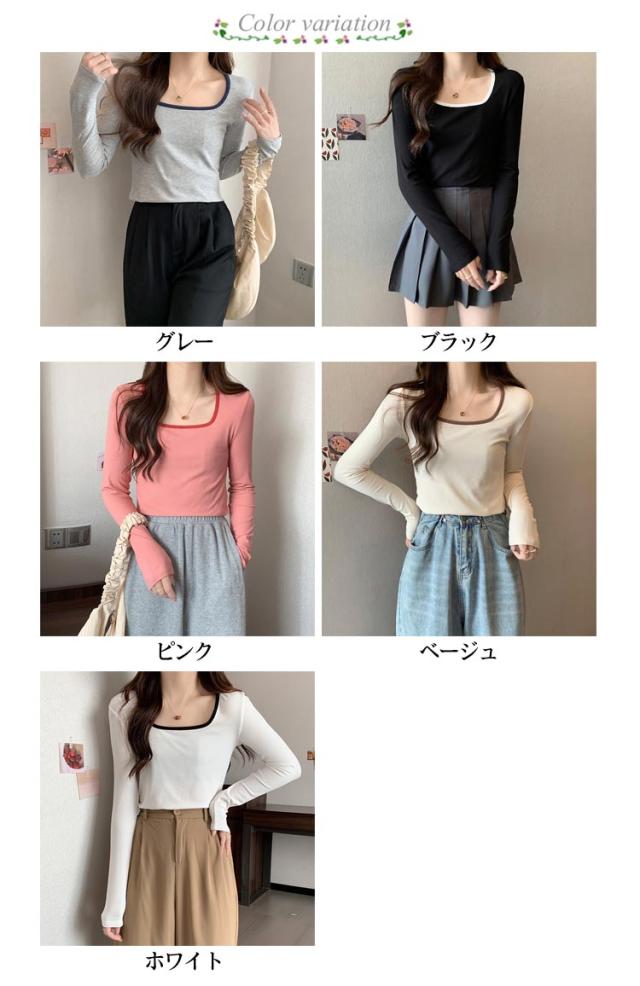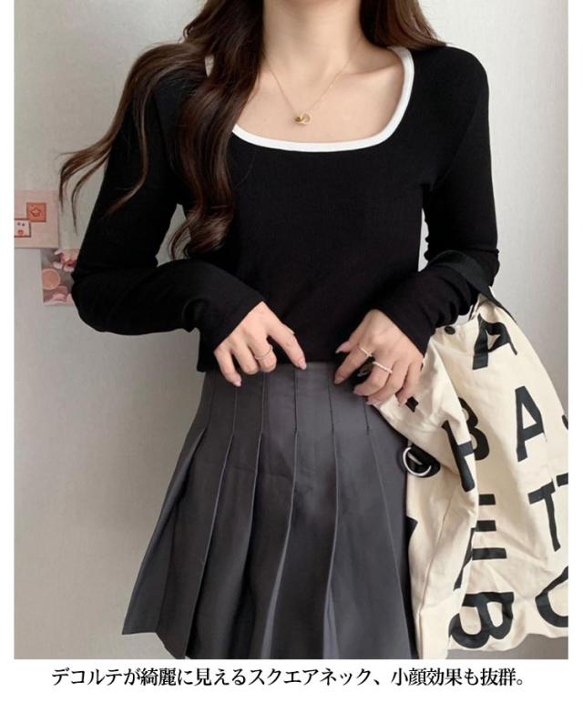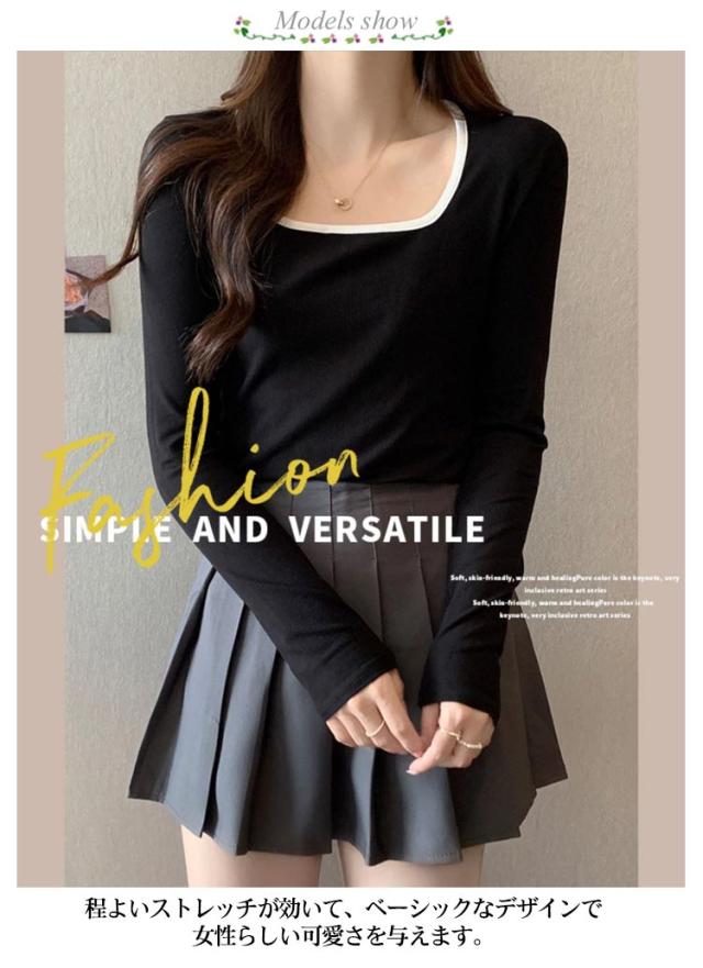 リブ トップス レディース 送料無料 Tシャツ インナー スクエアネック チュニック ニットカットソー プルオーバー 長袖Tシャツ シンプル 大人 ストレッチ 細身 秋 スリム 無地 きれいめ カジュアル 春 カットソー