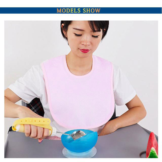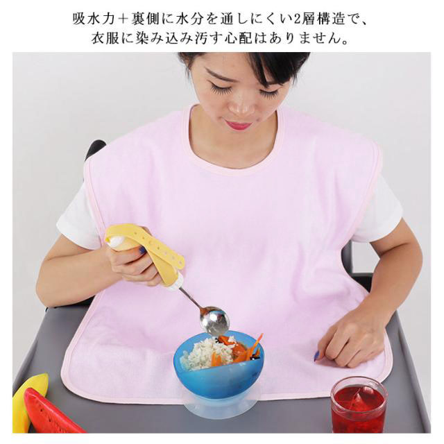| 子供からお年寄りまで幅広く使えるタオル地の食事用エプロン。 吸水力+裏側に水分を通しにくい2層構造で、衣服に染み込み汚す心配はありません。 食事の妨げにならない小さめサイズからテーブルまでエプロンをかけれる大きいサイズまでご用意しております。 シンプルな無地なので、洋服とのコーディネートも楽しめます。 取り外しもカンタンですので、おひとりに1枚 or 複数枚どうぞ! | |