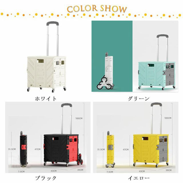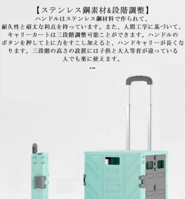 | 【強い耐荷重と容量】頑丈なポリプロピレン製、最大60KGの荷物が持ち運べるが、静止時の耐荷重は160KGに達しています。また、容量は約75リットルです。一度に多くの貨物を運ぶことができるという要件を満たし、時間と体力を節約しことができます。 【360度回る車輪&ブレーキ付き&静音】4輪は360度回転し、後輪はブレーキ付きで、坂道の路面でも滑らない。平らな路面でも、傾斜した路面でも、荷物を運びやすいです。それだけでなく、4つの車輪は全て静音タイヤを使用していて、コロコロと音を出すことは心配しないでください。 【ステンレス鋼素材&段階調整】ハンドルはステンレス鋼材料で作られて、耐久性と頑丈な利点を持っています。また、人間工学に基づいて、キャリーカートは三段階調整可能ことができます。ハンドルのボタンを押して上に力をすこし加えると、ハンドキャリーが長くなります。三段階の高さの設置には子供と大人等背が違っている人でも楽に使えます。 【折りたたみ式収納簡単】用しない時はコンパクトに折りたたむことができます。最短5秒で簡単に折り畳んで、隙間でも簡単に収納できます。家の中に収納する時は邪魔になりません。女性でも扱いやすいシンプルな組み立て方法です。後片付けも容易でお買い物などお気軽にご使用いただけます。 【様々なシーンに使える】お買い物だけではなく釣りやキャンプ、運動会などアウトドアでも使用できるタフな作り。フタ付きなので、座って休憩したり、アウトドアの際のテーブルになったり、このフタの上に荷物を置くことでさらに多くの荷物を運搬する子供できとても便利です。 | |