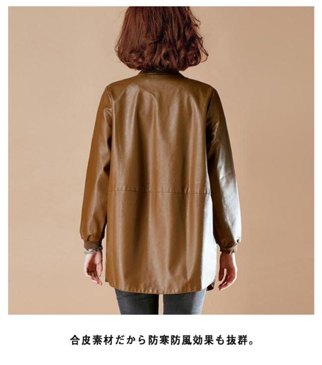 ノーカラー ロングコート アウター トレンチコート フェイクレザー レディース M−6XLサイズ!レザーコート スタジャン PU 合皮 ジャケット コート ミドル丈 春秋用 30代 40代 50代 フェイクレザー