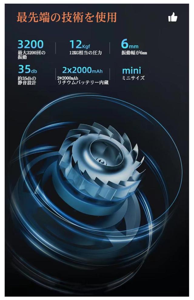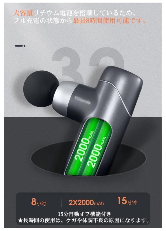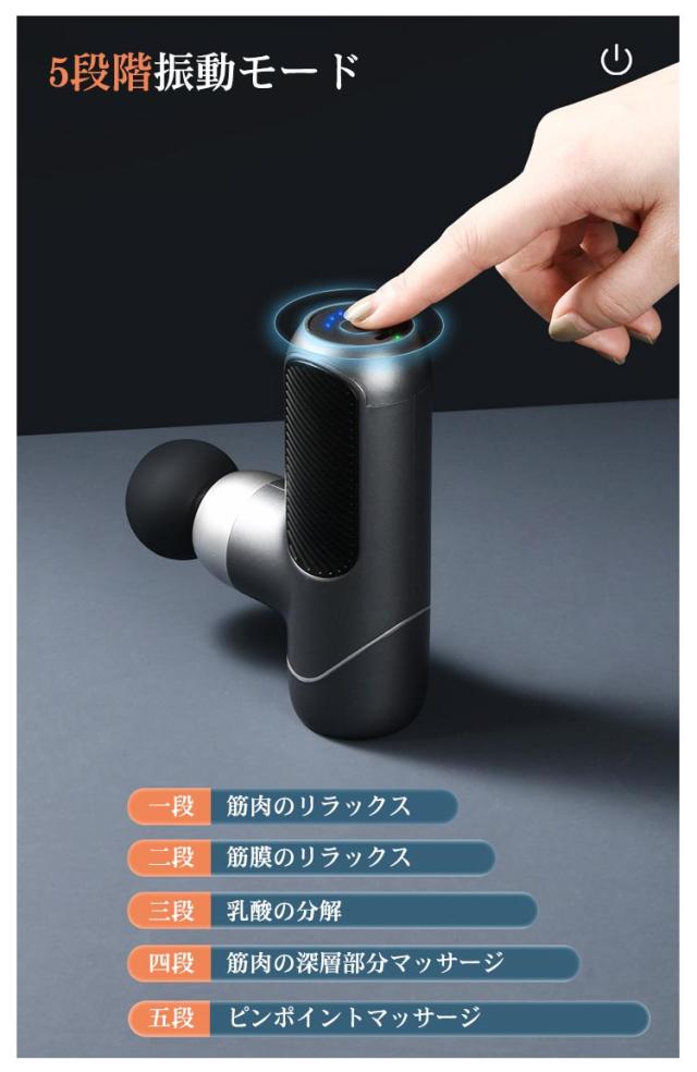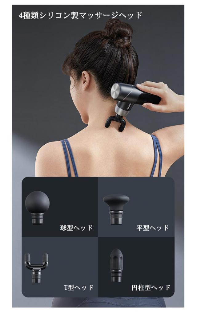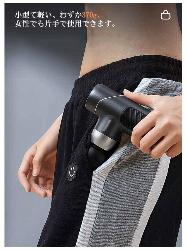| 【商品名】マッサージガン 【素材】ヘッド:シリコン 【サイズ】サイズ表 【特徴】 重さ:約370g マッサージヘッド:4個 振動調節:5段階 振動数:最大3200回/分 ストローク:6mm 電池:リチウムバッテリー 充電口:type-c 連続利用可能時間:約8時間 セット内容:マッサージガン本体、ヘッド*4、充電ケーブル*1、収納ケース*1、取扱説明書*1 【注意事項】 ※本製品は、治療等を目的とした医療機器・治療器・マッサージ機・マッサージ器・マッサージャーではありません。一般家庭用の運動補助器(雑貨)です。また、マッサージ効果を保証するものではありません。 ※違和感を感じる場合は使用をおやめください。 ※特定部分に長くマッサージしないでください。危険な部位を避けてご使用ください。 ※幼児、未成年者、妊娠中の女性、ペースメーカー、骨折または金属製のものを体に使用しないでください。 ※本製品を分解や修理、改造をしないでください。 ※頭・首・心臓・性器・骨への使用を禁止します。 ※ 医師から、各種マッサージおよびマッサージャー・マッサージ機・マッサージ器・マッサージガン等の使用を禁じられている方は、絶対にご使用にならないでください。 ※他のマッサージ機器との併用はお避け下さい。 | |