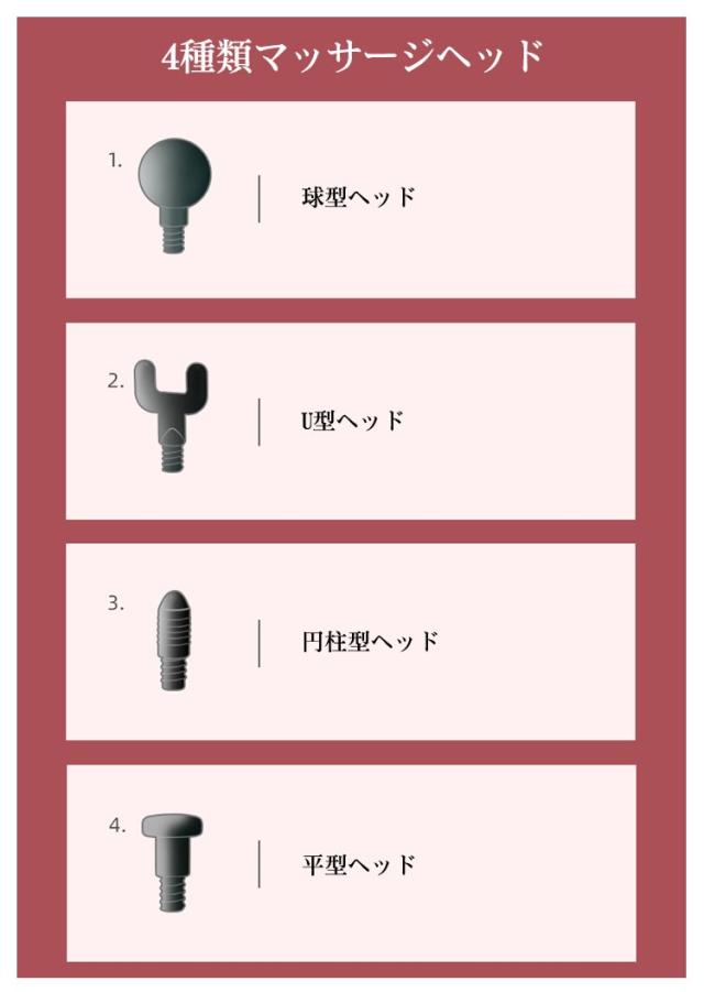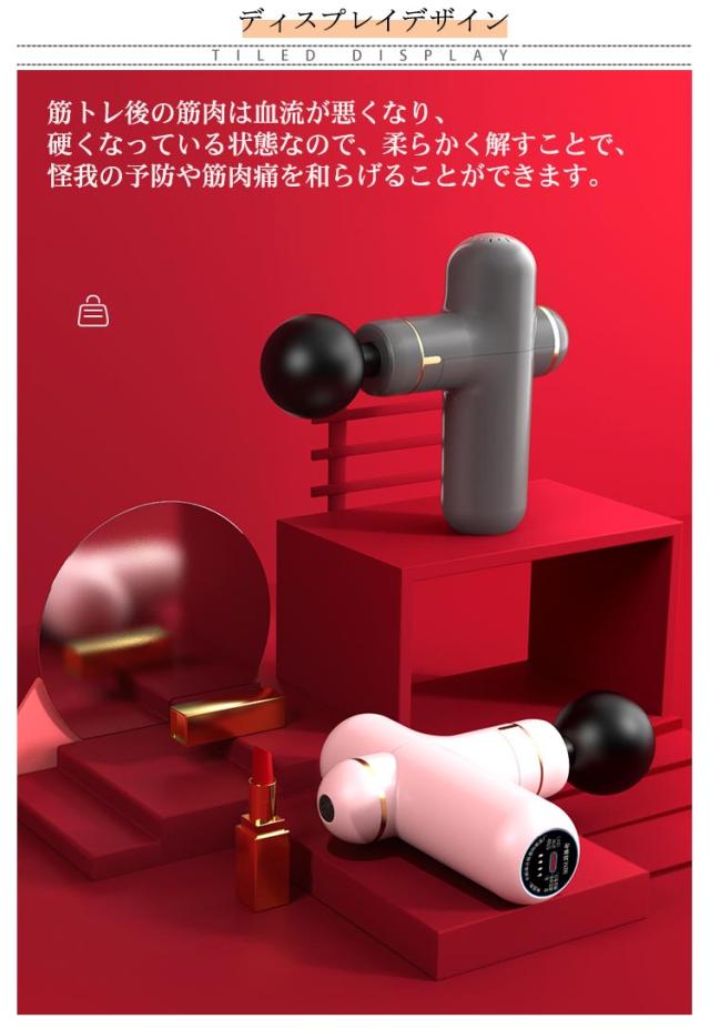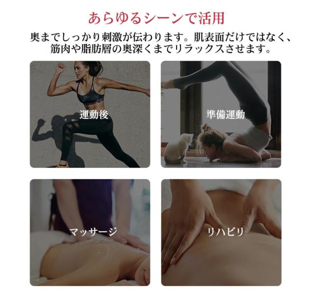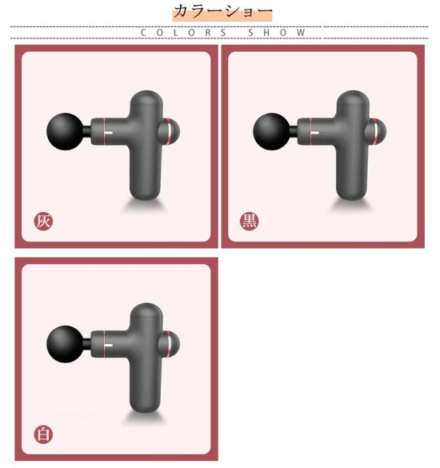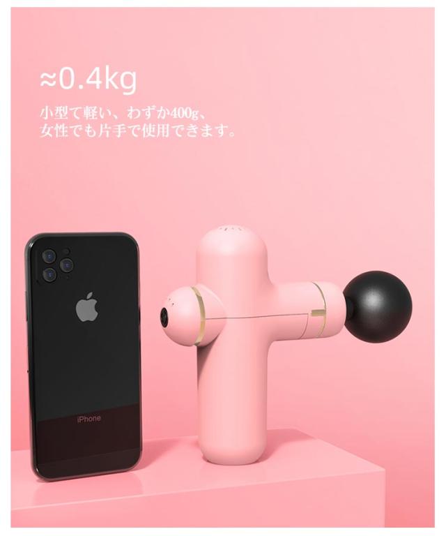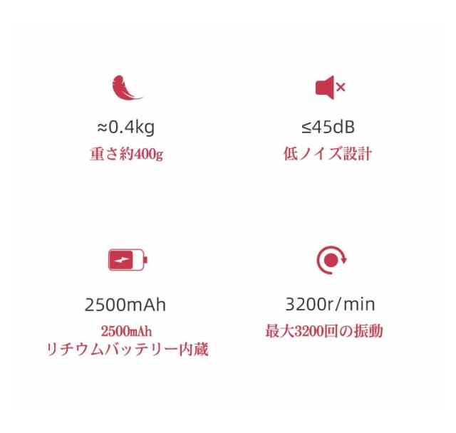 | 【商品名】マッサージガン 【素材】ABS その他 【サイズ】サイズ表 【特徴】 重さ:約400g マッサージヘッド:4個 振動調節:3段階 電池:リチウムバッテリー 充電口:type-c 連続利用可能時間:約4時間 セット内容:マッサージガン本体、ヘッド*4、充電ケーブル*1、取扱説明書*1 【注意事項】 ※本製品は、治療等を目的とした医療機器・治療器・マッサージ機・マッサージ器・マッサージャーではありません。一般家庭用の運動補助器(雑貨)です。また、マッサージ効果を保証するものではありません。 ※違和感を感じる場合は使用をおやめください。 ※特定部分に長くマッサージしないでください。危険な部位を避けてご使用ください。 ※幼児、未成年者、妊娠中の女性、ペースメーカー、骨折または金属製のものを体に使用しないでください。 ※本製品を分解や修理、改造をしないでください。 ※頭・首・心臓・性器・骨への使用を禁止します。 ※ 医師から、各種マッサージおよびマッサージャー・マッサージ機・マッサージ器・マッサージガン等の使用を禁じられている方は、絶対にご使用にならないでください。 ※他のマッサージ機器との併用はお避け下さい。 | |