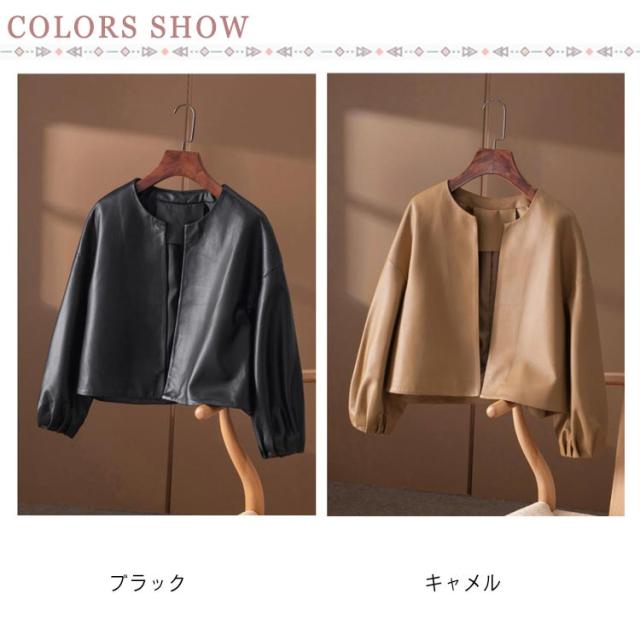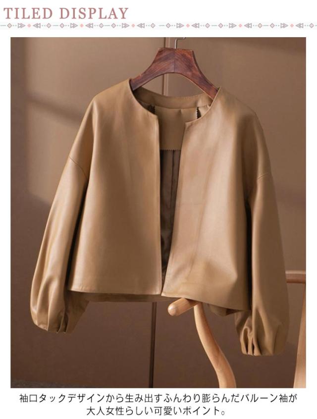 ノーカラージャケット アウター 20代30代40代 レザー 合皮 ショート丈 バルーンスリーブ レディース ライダースジャケット キレイめ 革ジャケット 女性 ジャケット