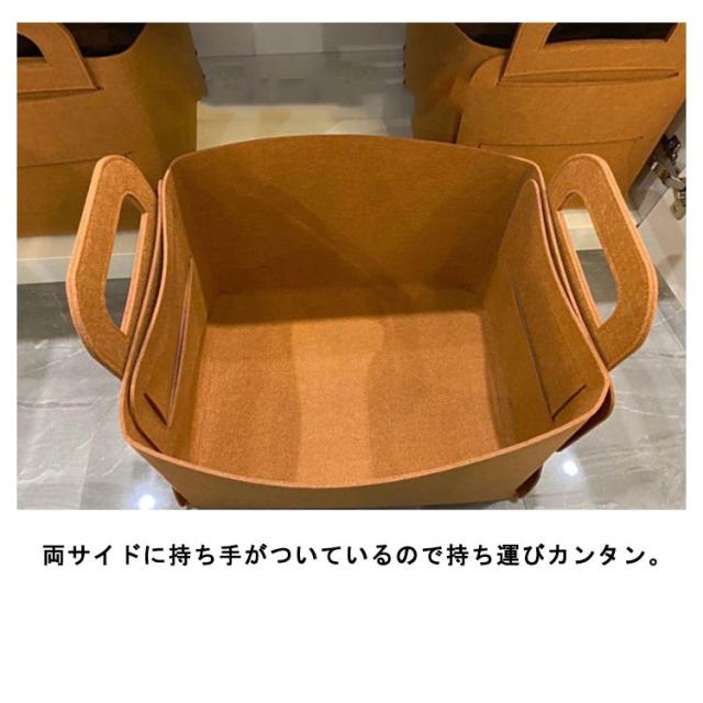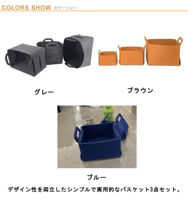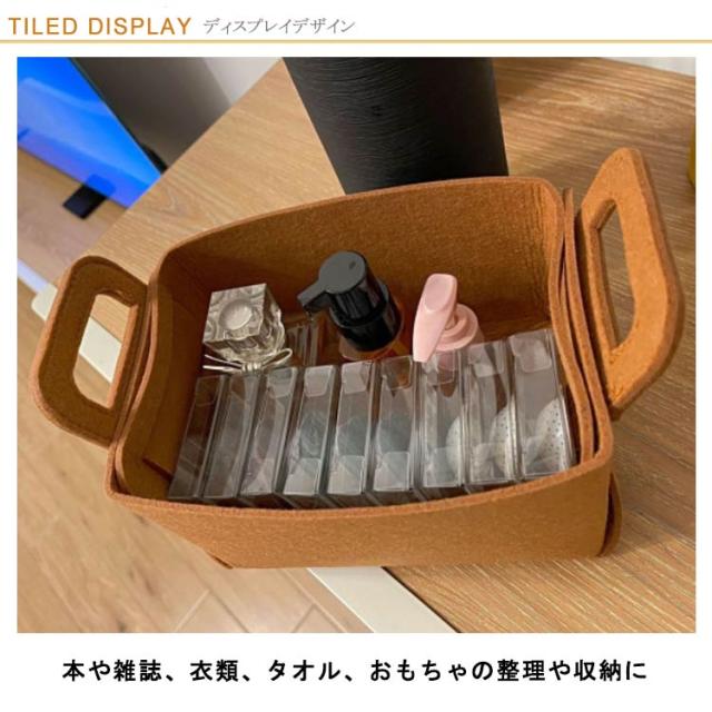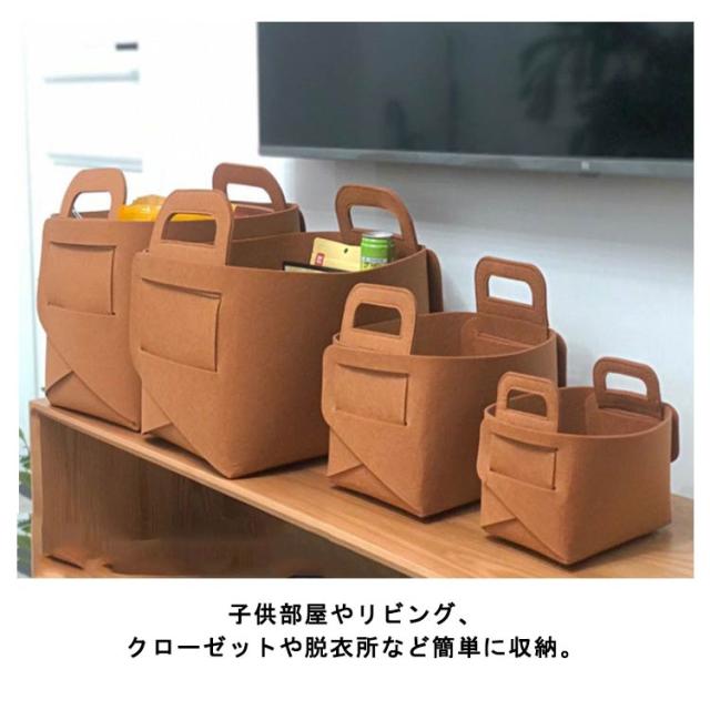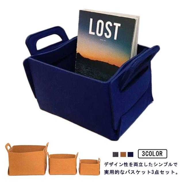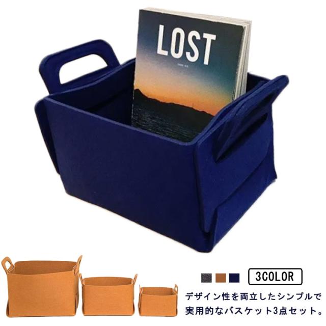 | デザイン性を両立したシンプルで実用的なバスケット3点セット。 子供部屋やリビング、クローゼットや脱衣所など簡単に収納。 本や雑誌、衣類、タオル、おもちゃの整理や収納に しっかり自立できるフェルト素材を採用しているので、型崩れしにくいです。 両サイドに持ち手がついているので持ち運びカンタン。 室内の見える場所においても違和感がなく、空間に馴染んでインテリアとしてもお楽しみいただけます。 使わない時は折りたたんで収納できるので、スペースを取りません。 | |