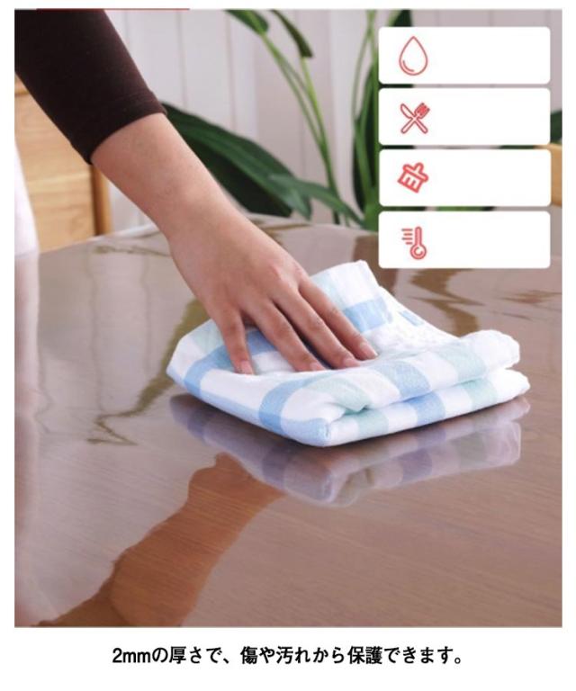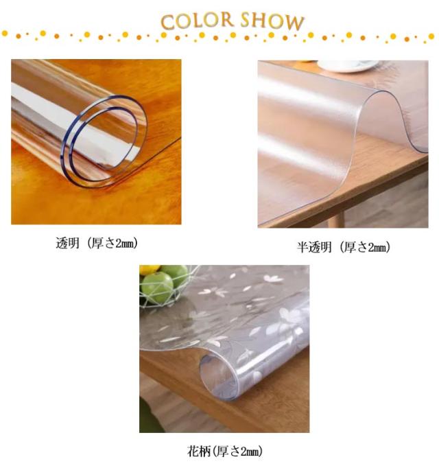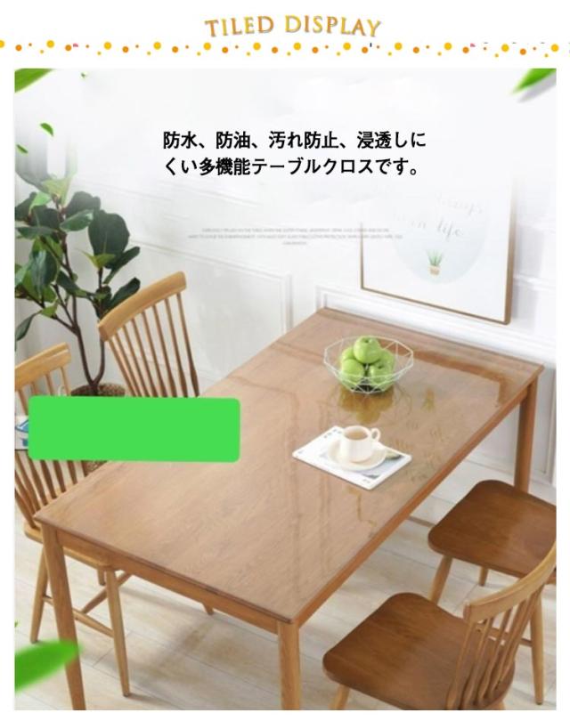 | PVCテーブルクロス、シンプルで明るいお部屋を彩ります!簡単に洗浄。無色透明で、木目や塗装色などの、家具本来の美しさを損なうことなくご使用いただけます。 防水、防油、汚れ防止、浸透しにくい多機能テーブルクロスです。 2mmの厚さで、傷や汚れから保護できます。 汚れやカビを防ぐ撥水加工でこぼしてもサッと拭くだけでいつも清潔。 水分を生地に浸み込まないので、食事を残した油汚れ、お醤油、スープなどの液体はすぐ拭けば簡単に拭きとることができます。 様々な場所の使用!キッチンテーブル、床、テーブル、野外ピクニックキャンプ、バーベキュー、バイキング、宴会、パーティー、結婚式、ホテル、レストラン。 | |