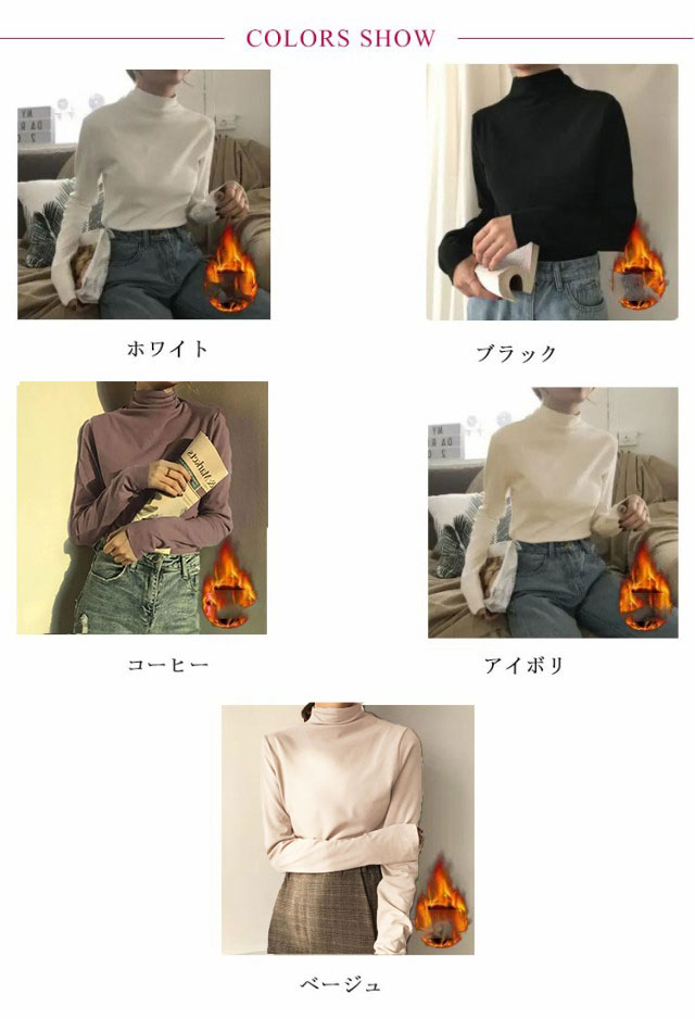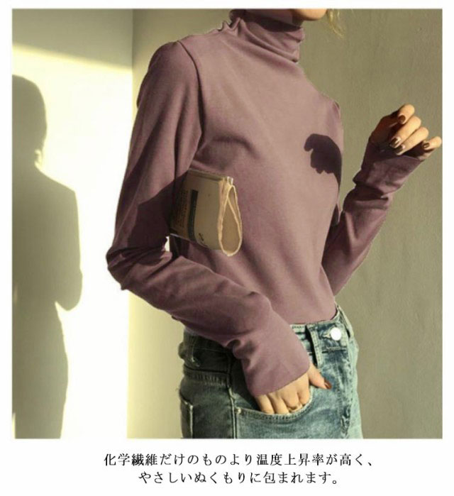 | とっても寒い日には首元まであたたかなタートルネックがおすすめ。 心地よく身体のラインに馴染むするりとした生地感の裏起毛ストレッチ素材。 化学繊維だけのものより温度上昇率が高く、やさしいぬくもりに包まれます。 体のラインを拾いすぎない生地厚は、1枚でも、インナーとしても大活躍! | |