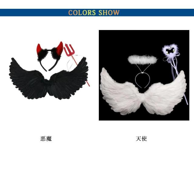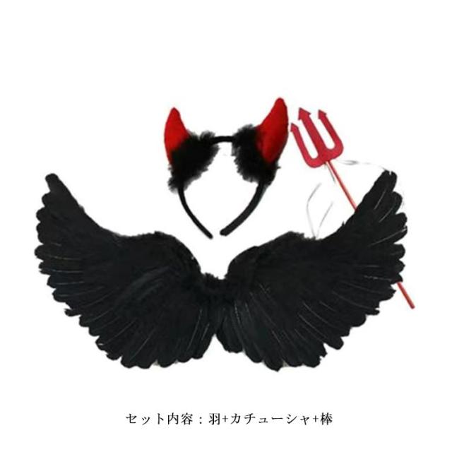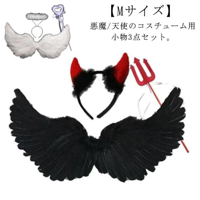 【Mサイズ】3点セット 悪魔/天使 ハロウイン コスチューム 悪魔の羽 フェザー 翼 羽根 エンジェル 大人 子供 コスプレ デビル 衣装 パーツ パーティー小物 妖精 カチューシャ 悪魔の棒 仮装 ハローウィン ツノ 黒 白 送料無料