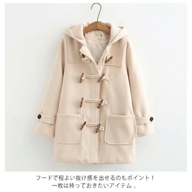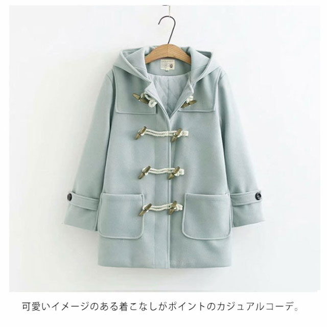 | シンプルながらも存在感のある可愛い女の子のダッフルコート! 裏地はキルティング加工された中綿入りなので、防寒性も抜群。 フードで程よい抜け感を出せるのもポイント!一枚は持っておきたいアイテム 。 両サイドに大きなポケットが付いて、実用性がとても高いです。 可愛いイメージのある着こなしがポイントのカジュアルコーデ。 | |