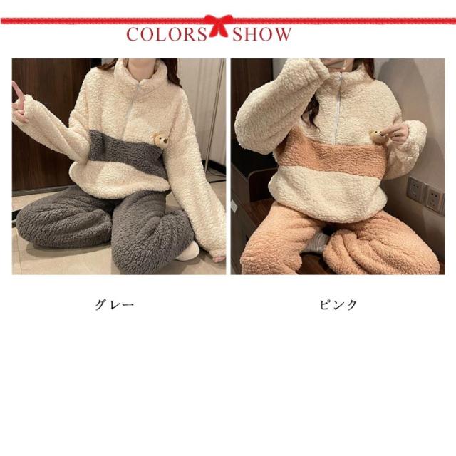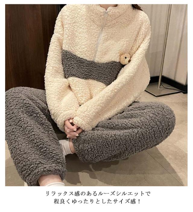 プルオーバー 防寒 レディース 部屋着 秋冬 パジャマ ハーフジップ ハイネック 上下セット もこもこ ボア パーカー 厚手 ゆったり 配色 保温 あたっか クマ付き 無地 学生 可愛い 女の子 女子 ルームウェア