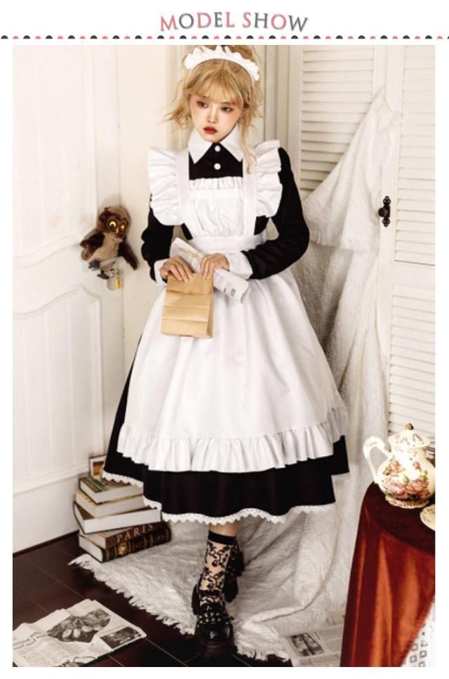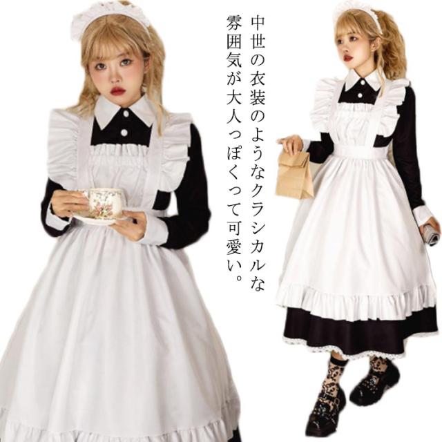| 中世の衣装のようなクラシカルな雰囲気が大人っぽくって可愛い。 ふわっと広がったスカートで上品な印象に。全体のシルエットが美しく見えるようこだわりました。 フリルのついたエプロンやカチューシャなどがセットになっていて、本格的なメイド服です。 テーマパークやハロウィン、コスプレ、仮装パーティにはもちろん、結婚式の余興やイベントなどにも使えます! | |