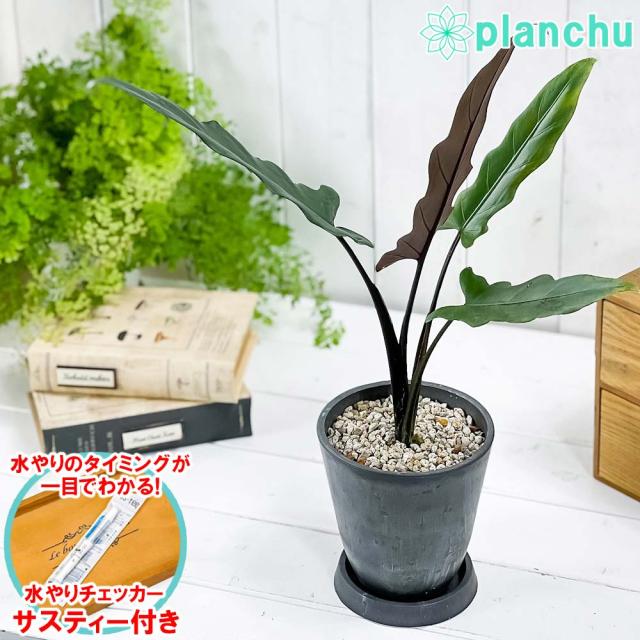 PLANCHU 観葉植物 アロカシア ラウテルバキアナ 4号樹脂鉢 ダークグレー サスティー付き 受け皿付き 育て方説明書付き Alocasia lauterbachiana アロイド