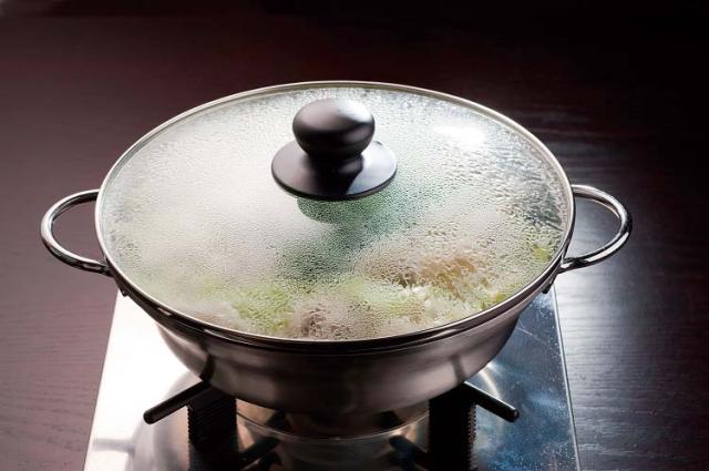 そんなもつ鍋を気軽に楽しめるよう、吹きこぼれにくい形状の鍋とガラス蓋をセットにしました。