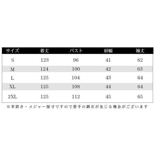 | サイズについての説明 | 【M】着丈113 バスト96 ウエスト88 袖丈62 肩幅41 参考体重42-50kg 【L】着丈114 バスト100 ウエスト94 袖丈63 肩幅42 参考体重50-57kg 【XL】着丈116 バスト104 ウエスト98 袖丈64 肩幅43 参考体重57-62kg 【2XL】着丈118 バスト108 ウエスト102 袖丈64 肩幅44 参考体重62-69kg 【3XL】着丈118 バスト112 ウエスト106 袖丈65 肩幅45 参考体重69-77kg |