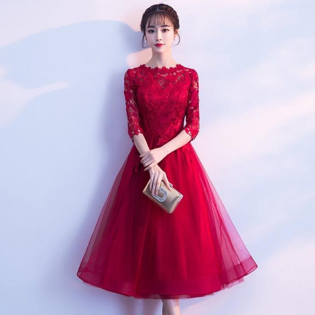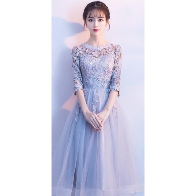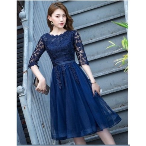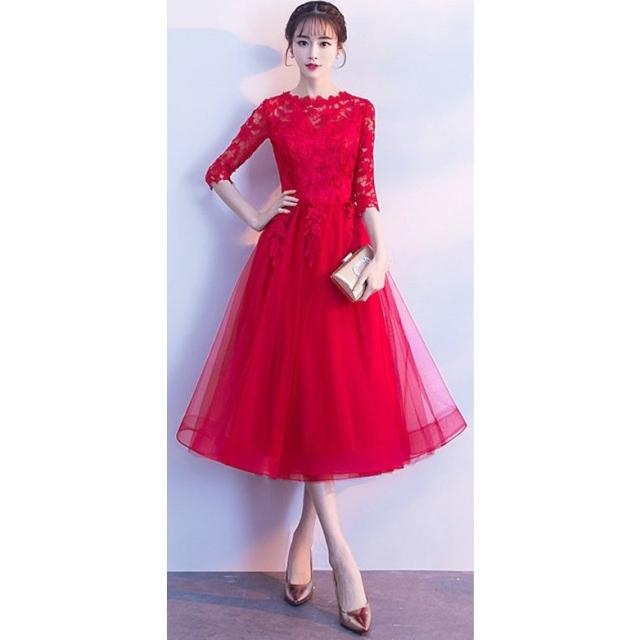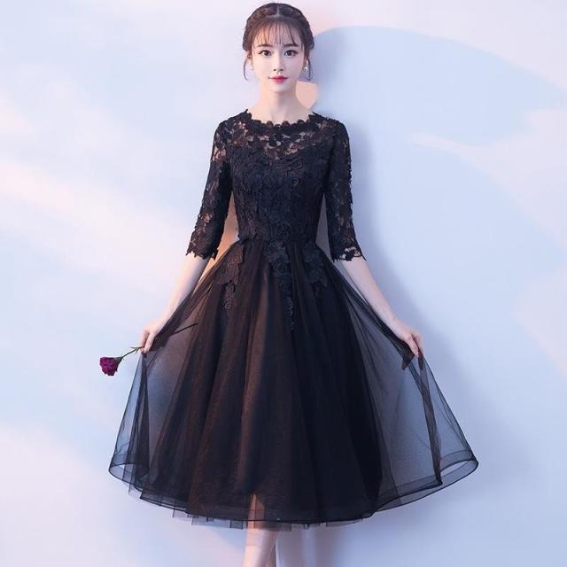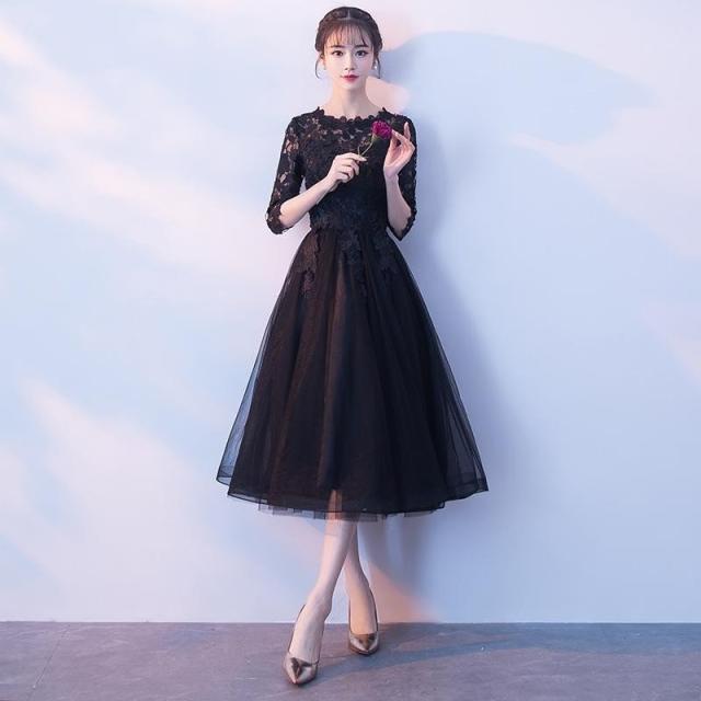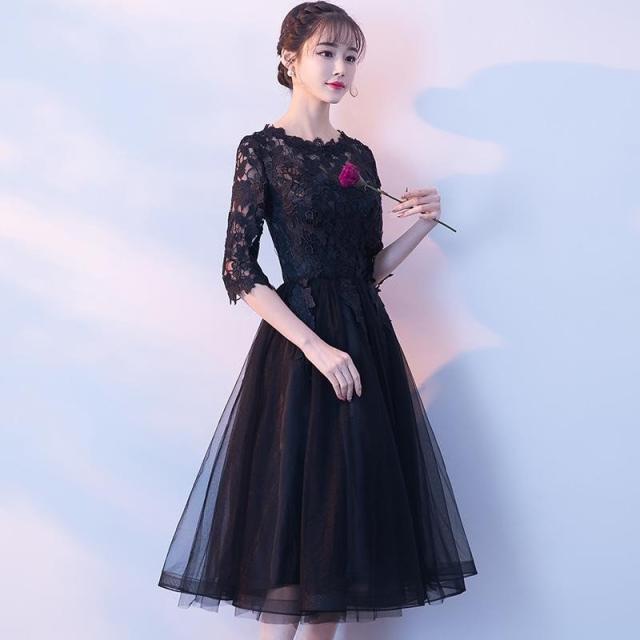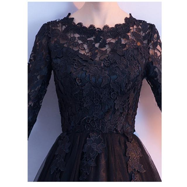 パーティードレス 七分袖 ミモレ丈 黒レース ワンピース 結婚式 披露宴 コンサート カラードレス【フィッシュテール、ミドル】
