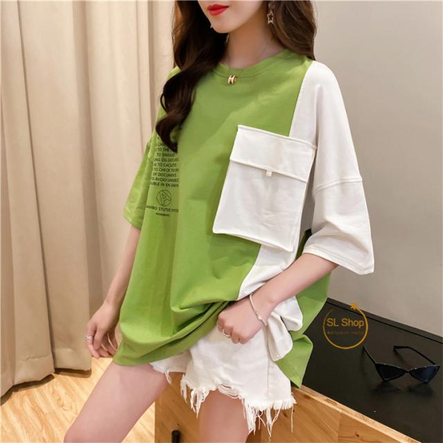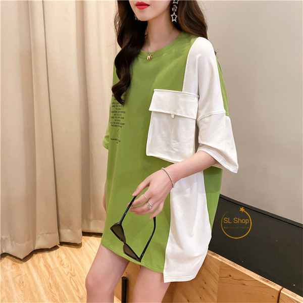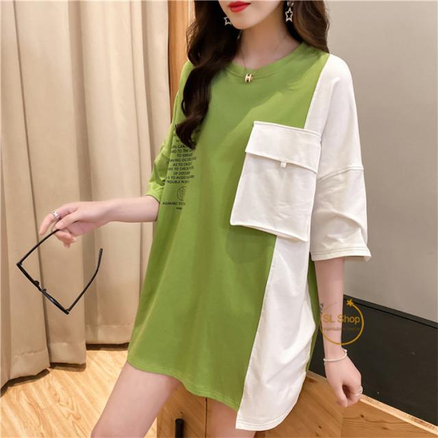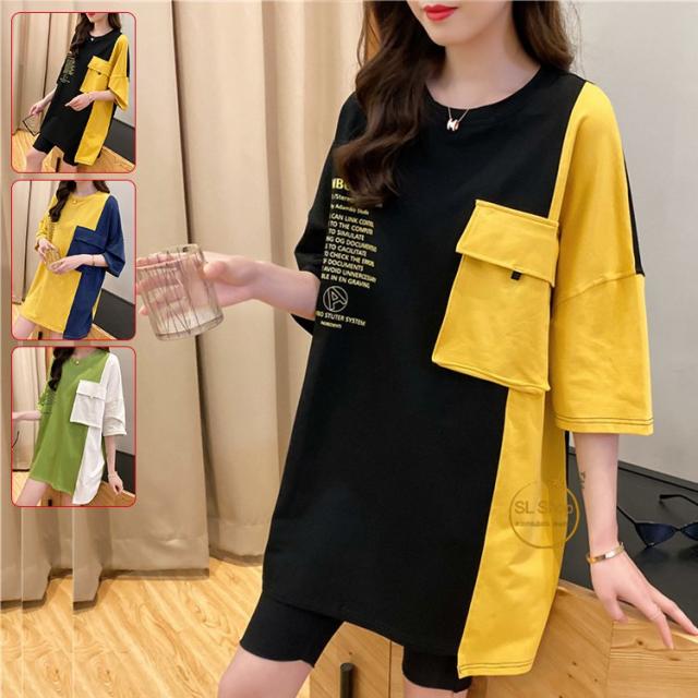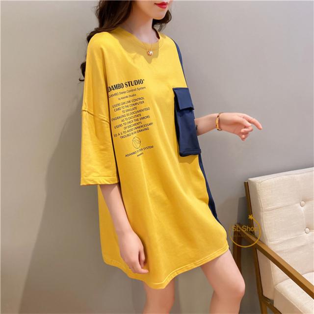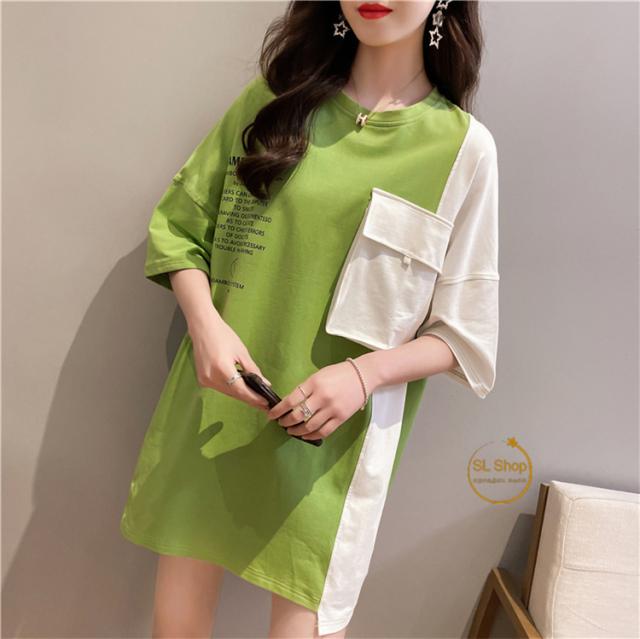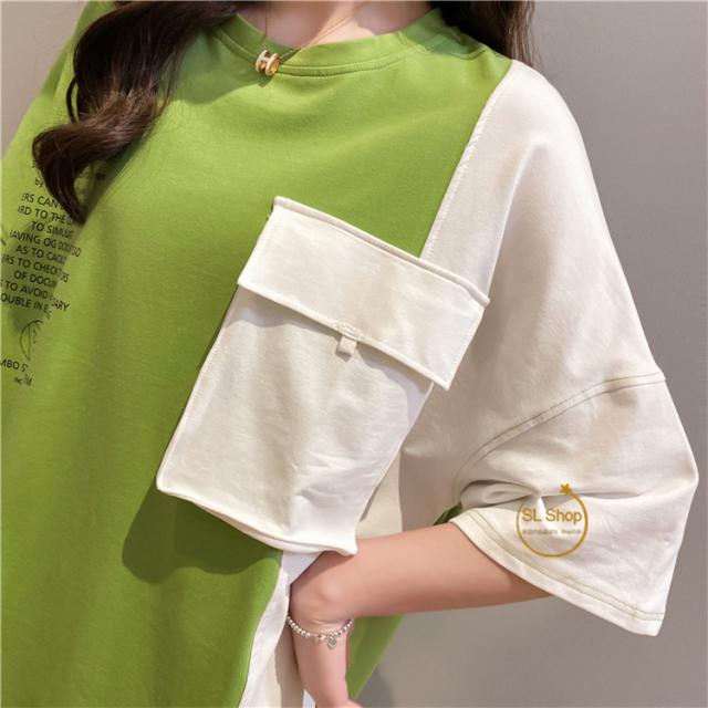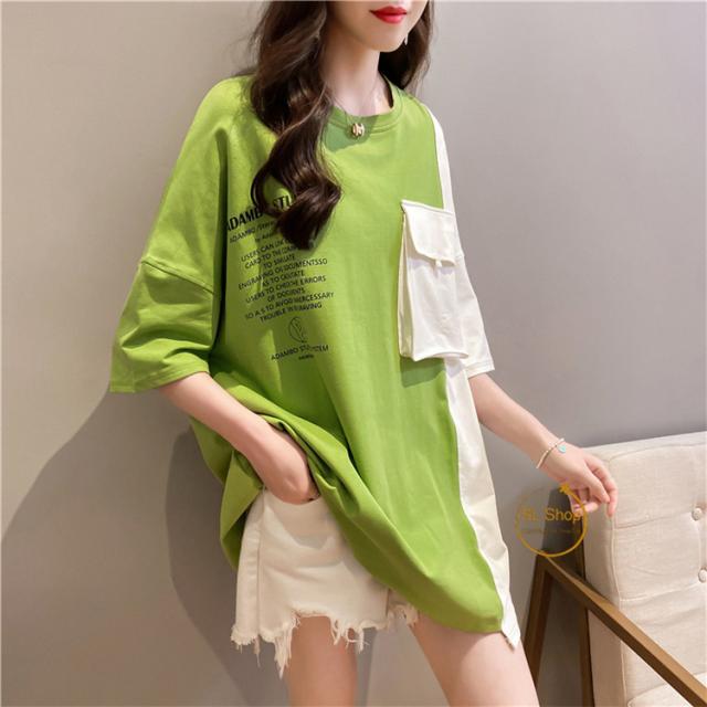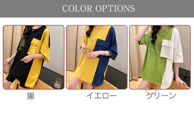 Tシャツ レディース 半袖 ロンティー カットソー 切り替え 配色 ポケット ゆったり トップス 2021 夏