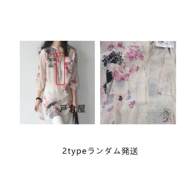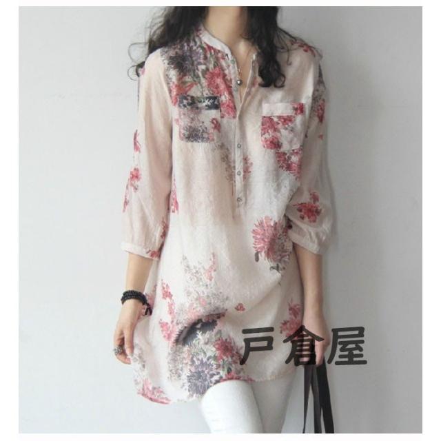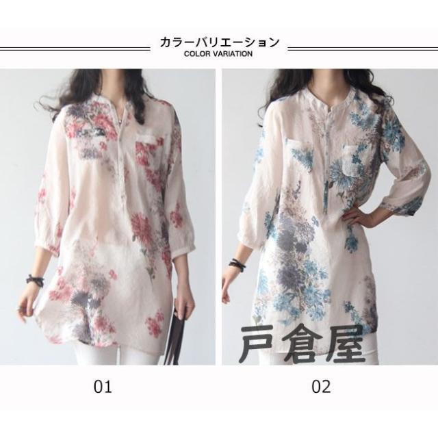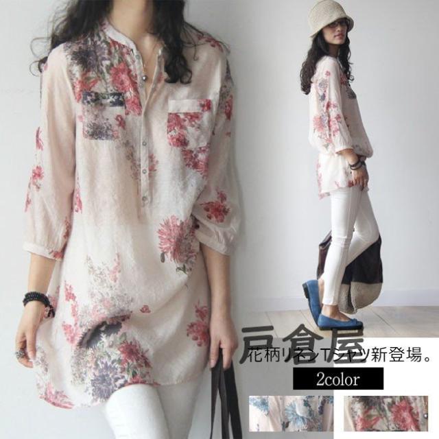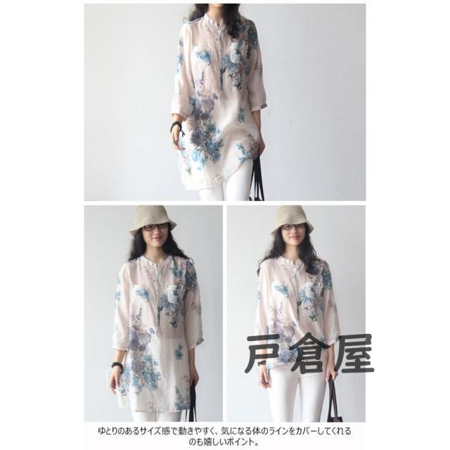Tシャツ レディース 7分袖 ヘンリーネック ゆったり 花柄 リネン 大きいサイズ ブラウス トップス オシャレ カジュアル 春 夏 秋