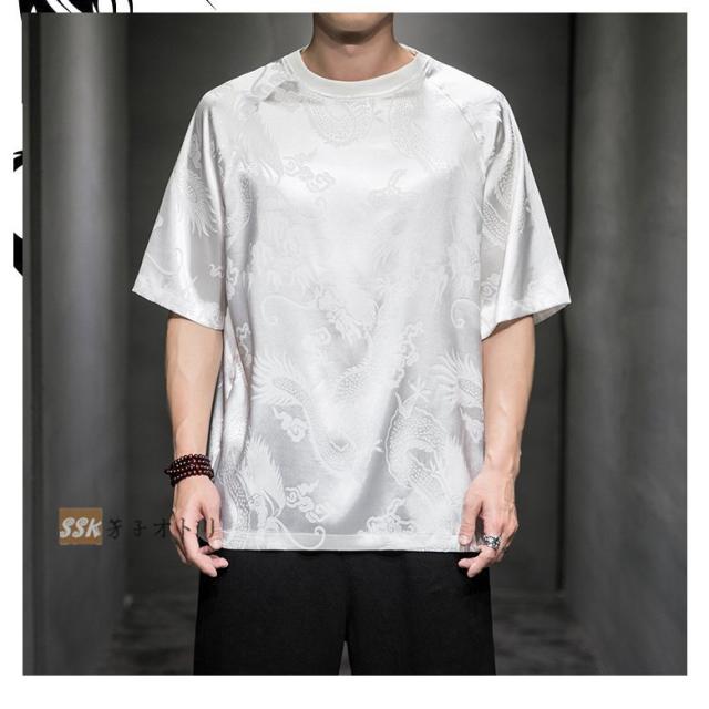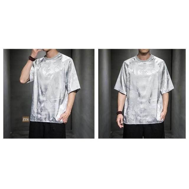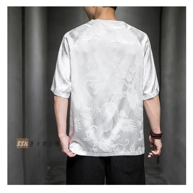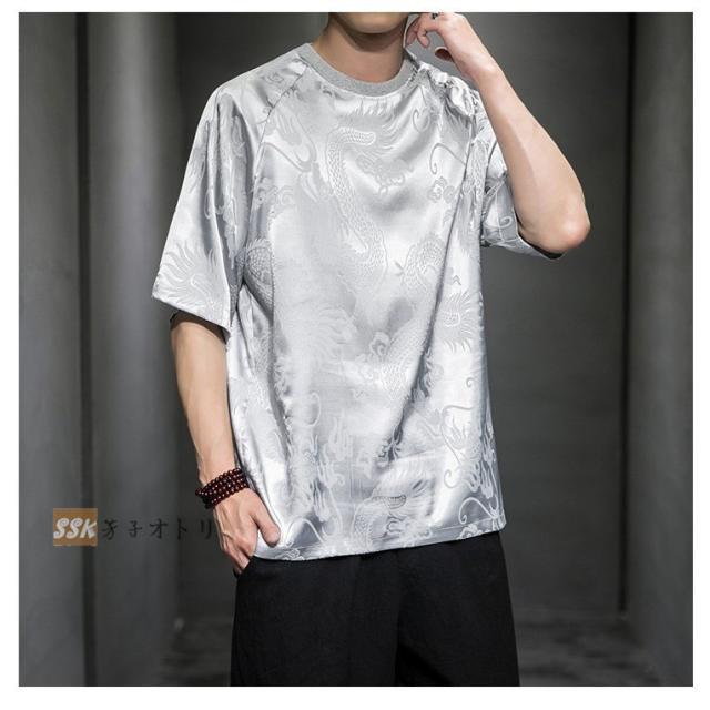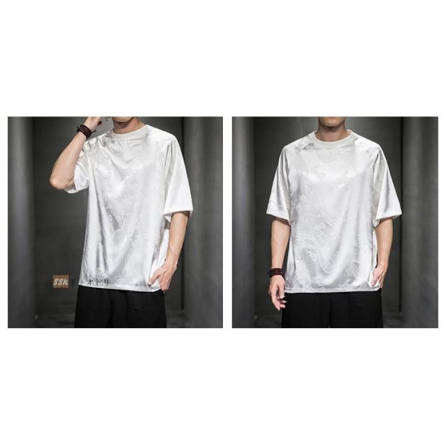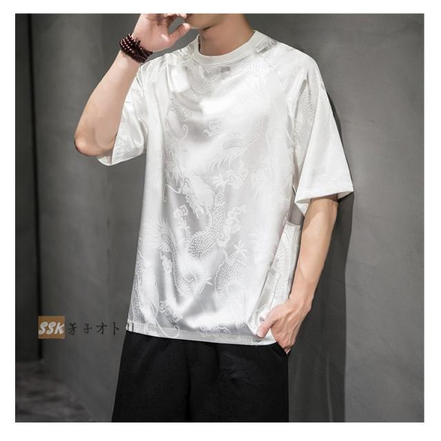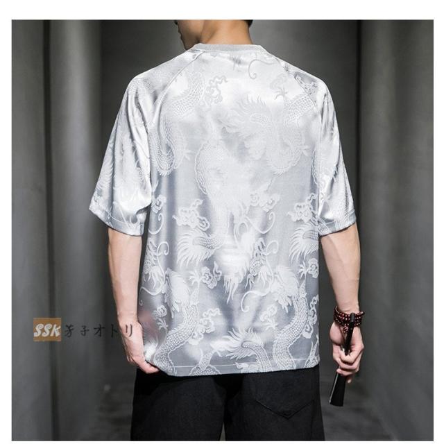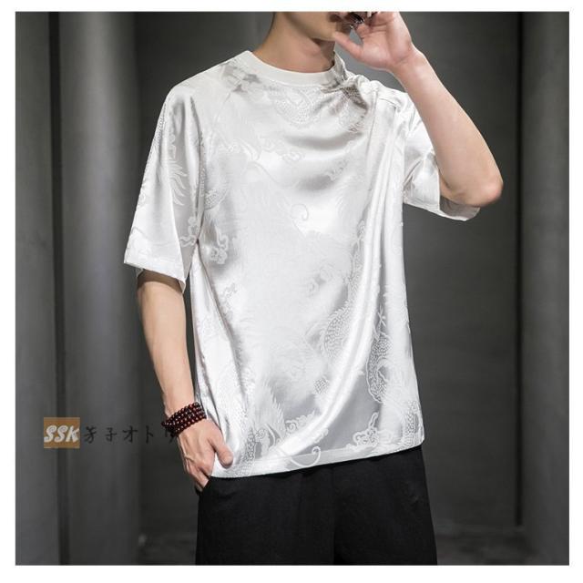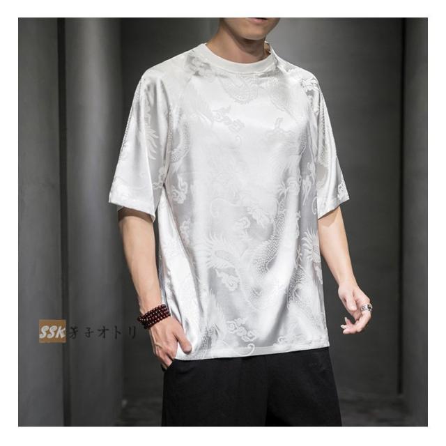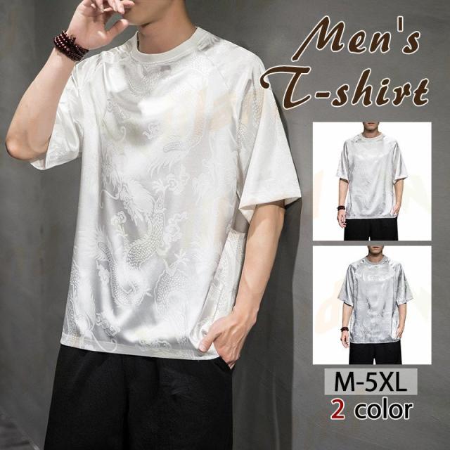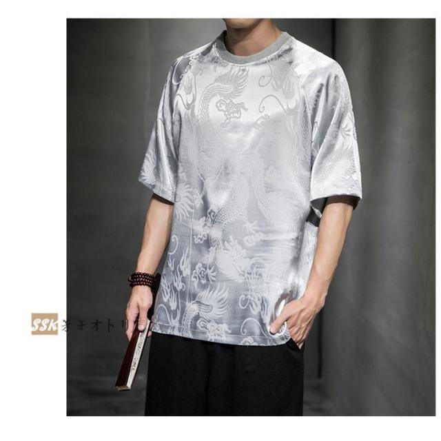Tシャツ メンズ 夏服 五分袖Tシャツ 龍柄 トップス ティーシャツ クルーネック 中華風 チャイナ服 ゆったり 涼しい