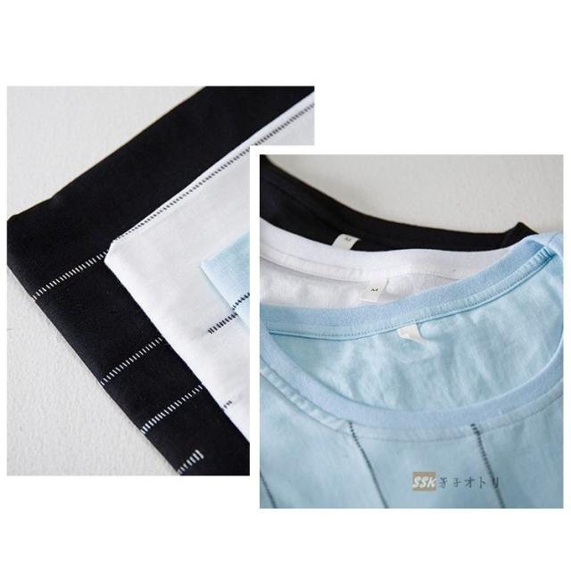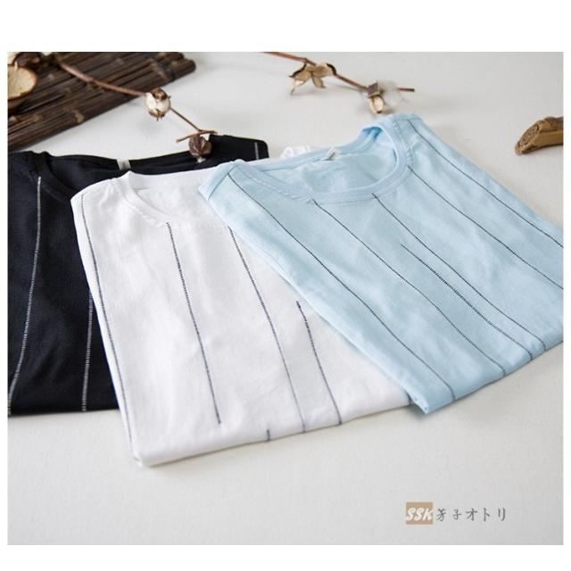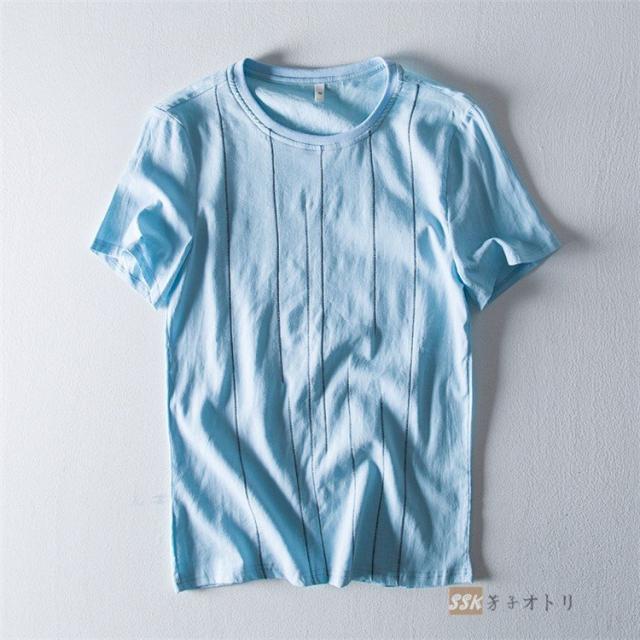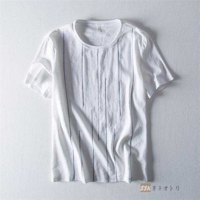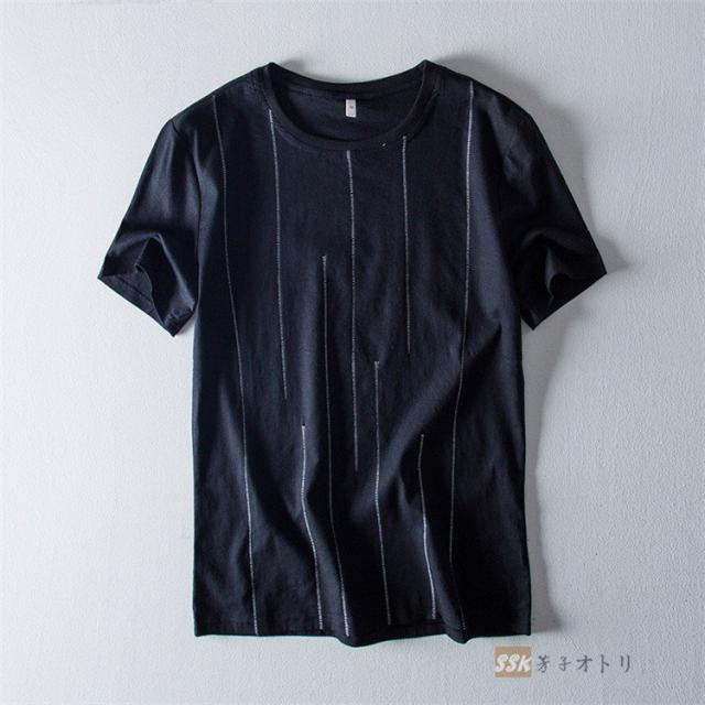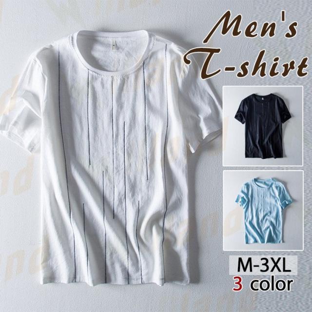 Tシャツ メンズ 麻 リネンTシャツ 半袖Tシャツ 夏服 クルーネック ストライプ柄 カジュアルTシャツ トップス 薄手