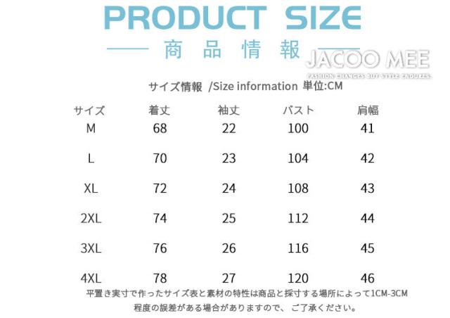 | サイズについての説明 | 実寸: M:着丈68cm、バスト100cm、肩幅41cm、袖丈22cm L:着丈70cm、バスト104cm、肩幅42cm、袖丈23cm XL:着丈72cm、バスト108cm、肩幅43cm、袖丈24cm 2XL:着丈74cm、バスト112cm、肩幅44cm、袖丈25cm 3XL:着丈76cm、バスト116cm、肩幅45cm、袖丈26cm 4XL:着丈78cm、バスト120cm、肩幅46cm、袖丈27cm ※平置き実寸で作ったサイズ表と素材の特性は商品と採寸する場所によって1cm-3cm程度の誤差がある場合がありますので、 ご了承ください。 |