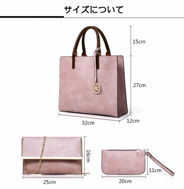 | サイズについての説明 | 【サイズ】横×高さ×マチ幅(cm) ハンドバッグ:32×27×12 ショルダーバッグ:25×16×- クラッチバッグ:20×11×- ※多少の誤差はご了承ください。 【カラー】ピンク、レッド、ブラウン、グレー、ブラック |