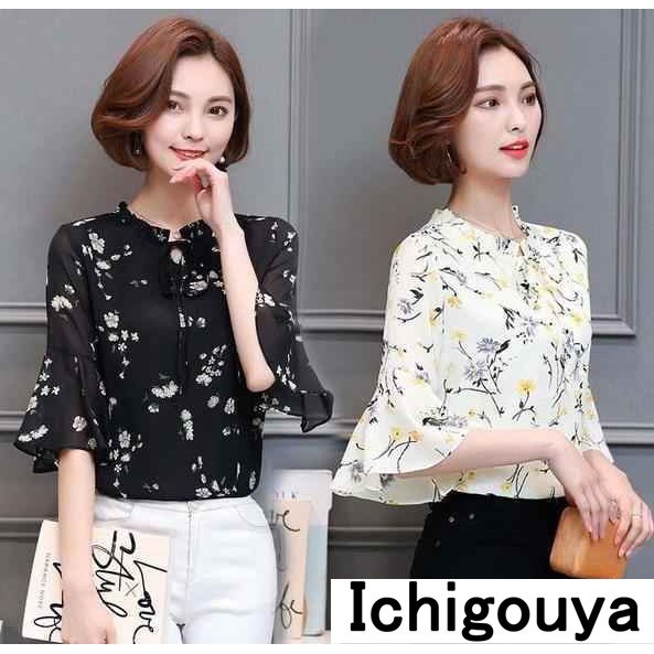 シフォン ブラウス 半袖 トップス 春夏 フレアスリーブ ブラウス 花柄