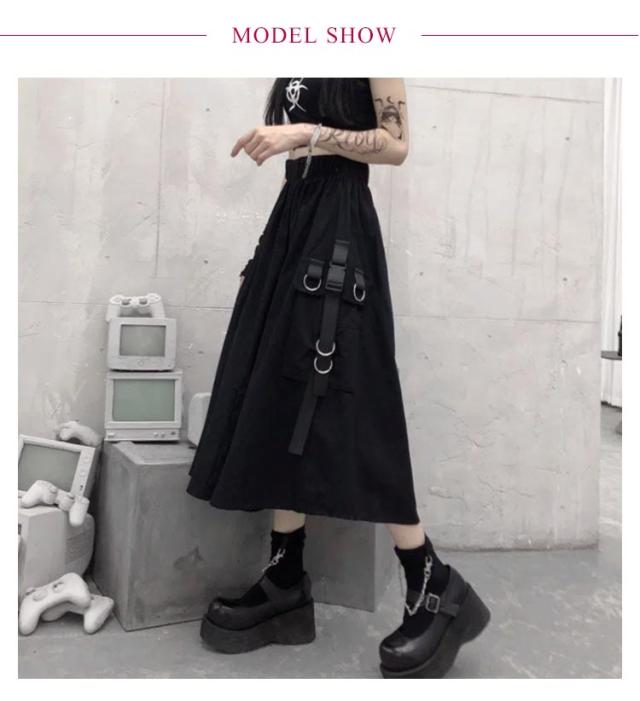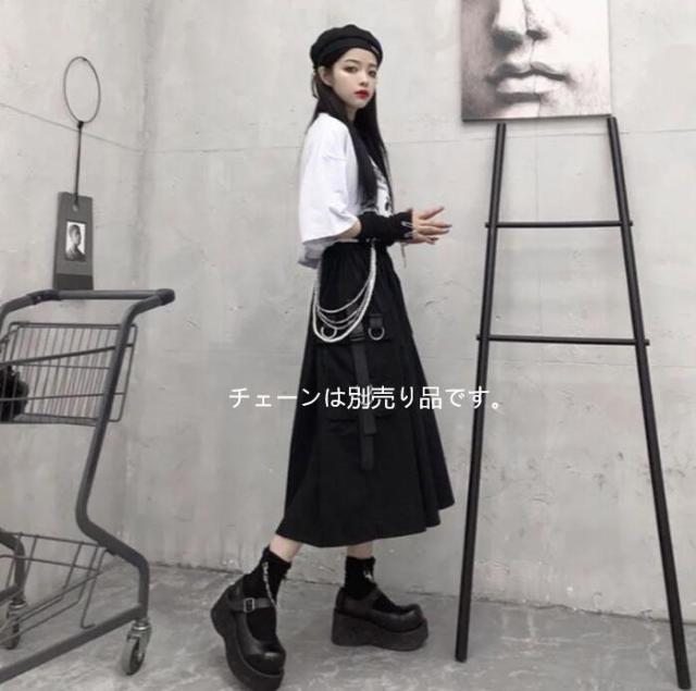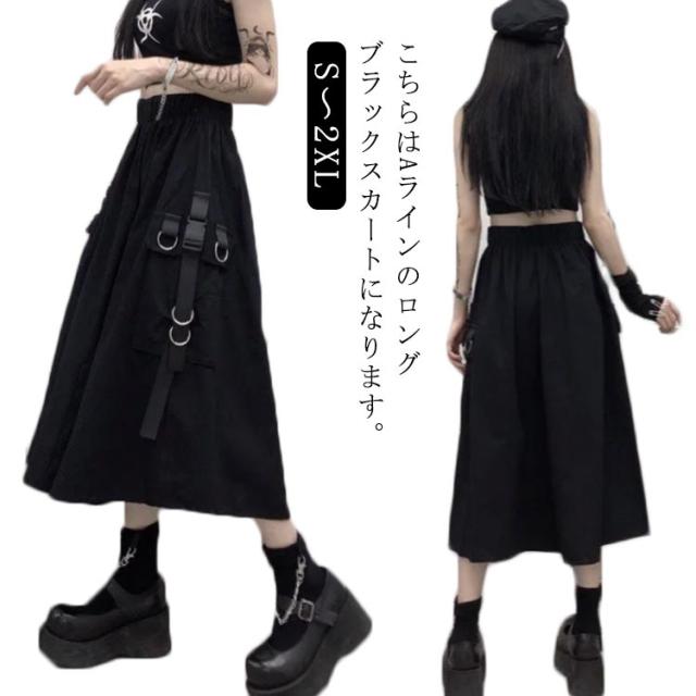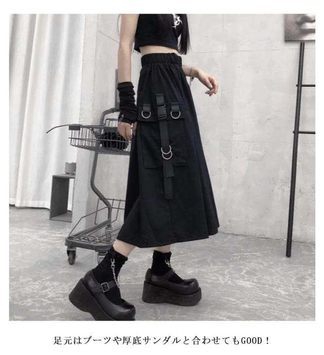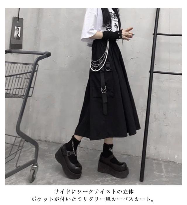 | こちらはAラインのロングブラックスカートになります。 サイドにワークテイストの立体ポケットが付いたミリタリー風カーゴスカート。 もちろんそのまま着てもオシャレなロングスカートは、ウエストゴム仕様で楽な着心地♪ 足元はブーツや厚底サンダルと合わせてもGOOD! | |