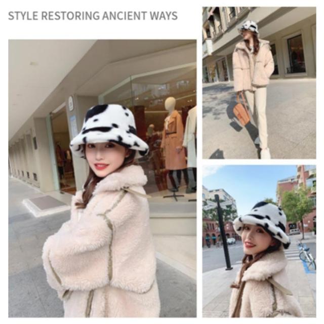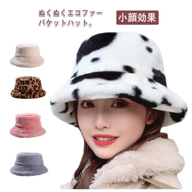 ふわふわ レディース 牛柄 小顔効果 フェイクファー 帽子 防寒 送料無料 厚手 バケットハット 防寒 男性 女性 ヒョウ柄 無地 ベージュ ブラウン バケットハット