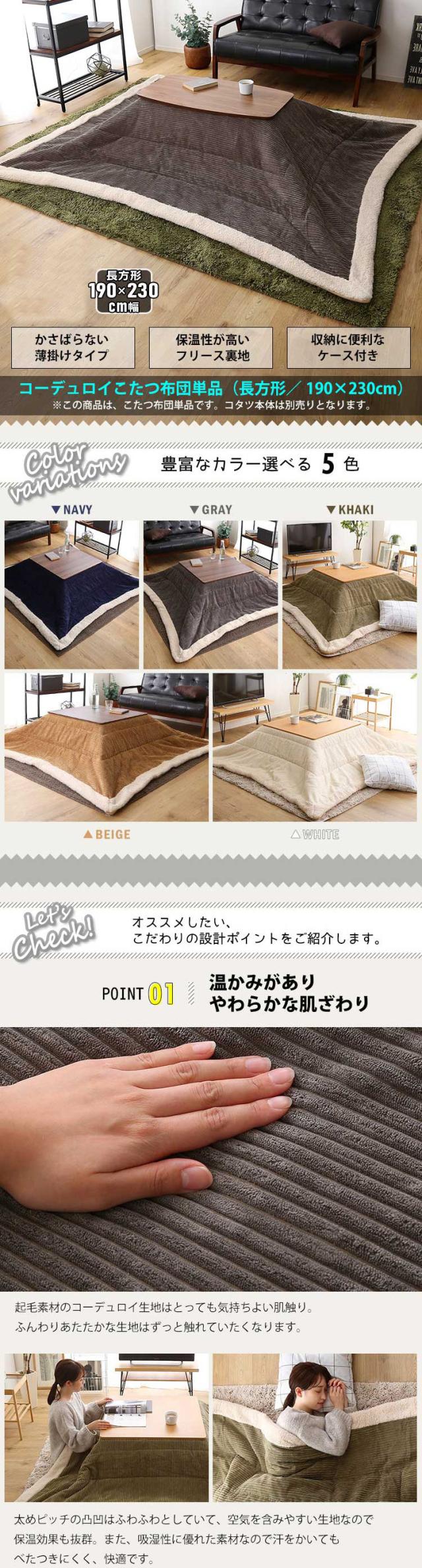 【掛け布団単品】MUKF コーデュロイ 薄掛け こたつ布団 幅190 奥行230cm (長方形) カーキ/全5色 【120cm長方形こたつ用 】 コンパクト スリム おしゃれ 北欧 コタツ布団 掛布団