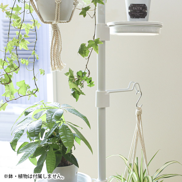 つっぱり式のハンギングポールと吊鉢が掛けられるフック、植木鉢が置けるプレートのセット。