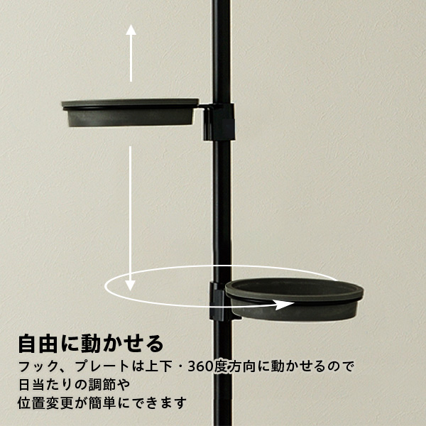 自由に動かせるプレートとフックは上下、360度方向に自由に動かせるので、日当たり調節や位置変更が簡単にできます。