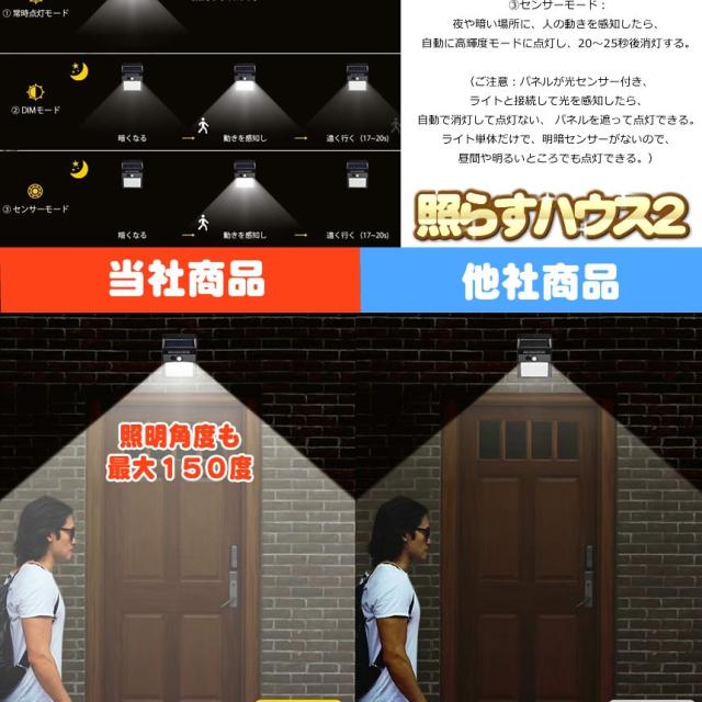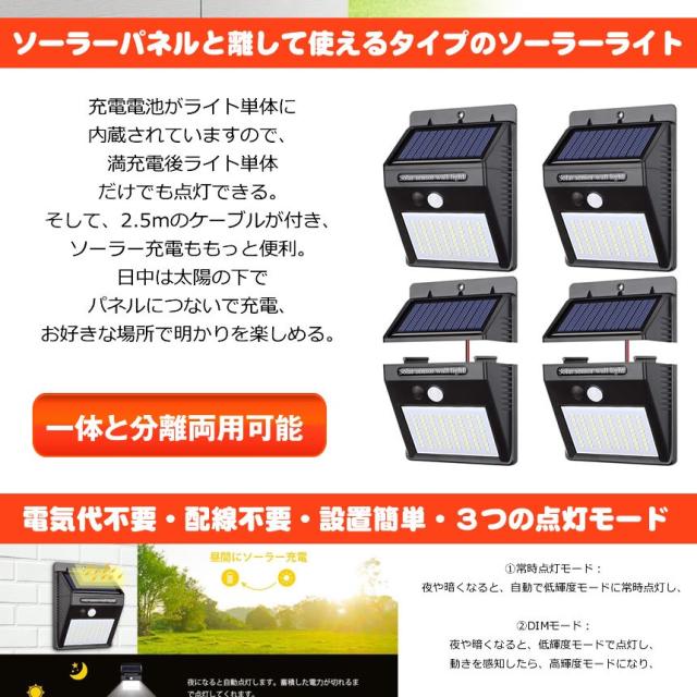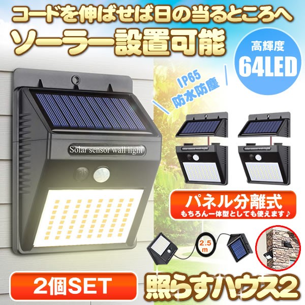 センサーライト 2個セット 分離型 64LED 屋外 LED ソーラーライト パネル分離 太陽光発電 防犯 防水 玄関 庭 屋外 2TERA