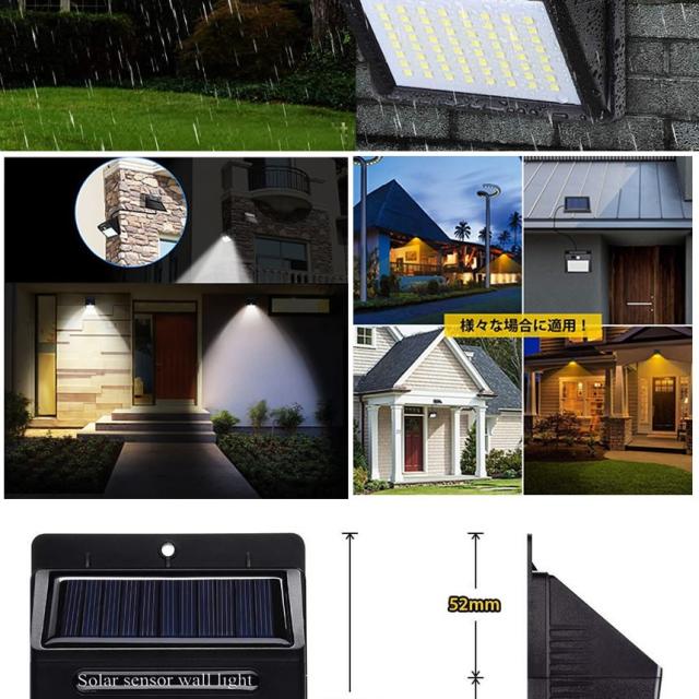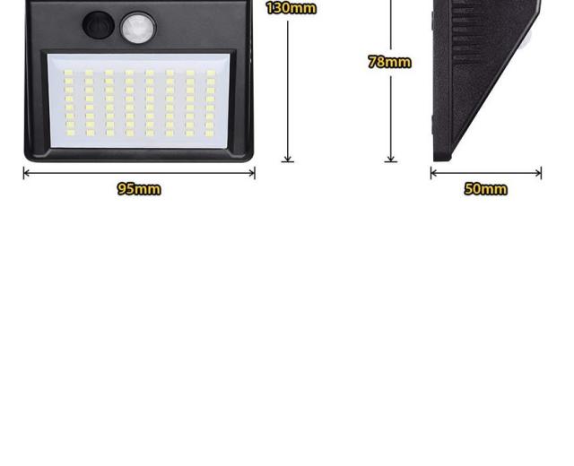 重量:230g ● 光源:64pcsLED灯、昼白光 ● 防水:IP65 ● ソーラーパネル:5.5V 0.75W 単結晶シリコン ● 色温度:6000〜6500K ● センサー距離:?3m ●