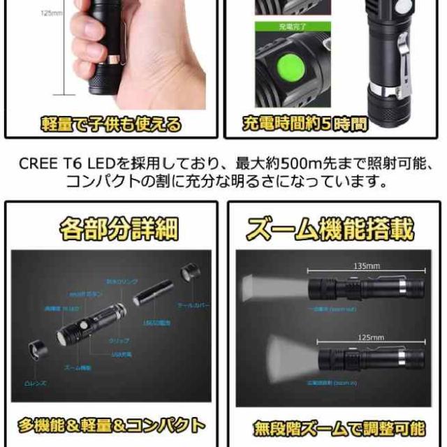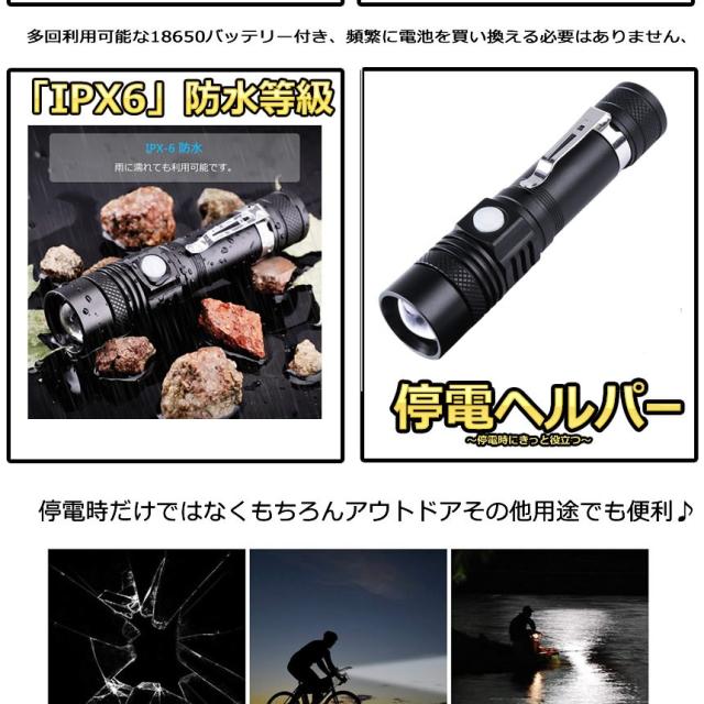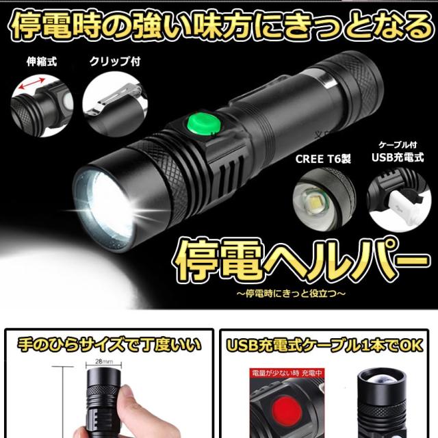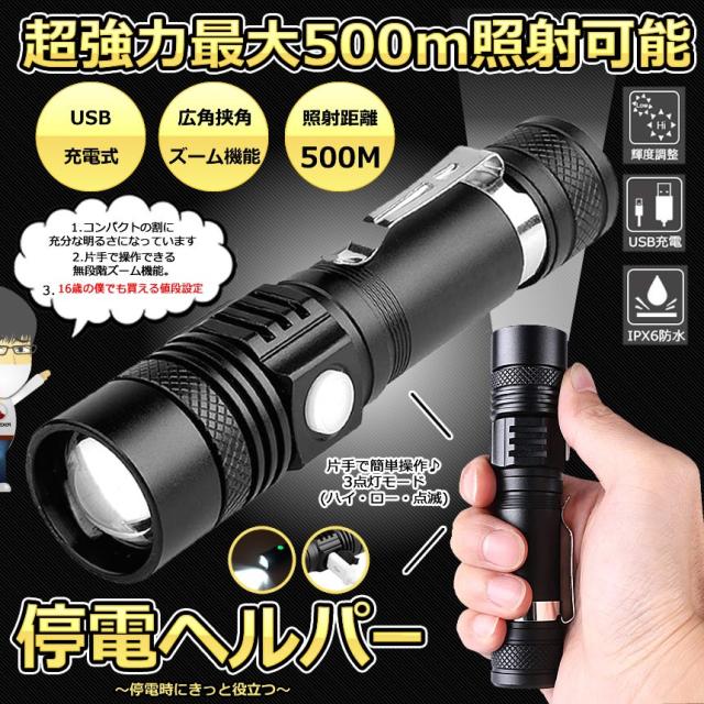 停電ヘルパー 懐中電灯 LED 強力 500m ズーム 停電 超高輝度 ハンディライト ズーム 充電式 アウトドア TEIHELP