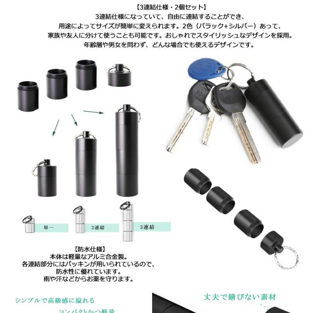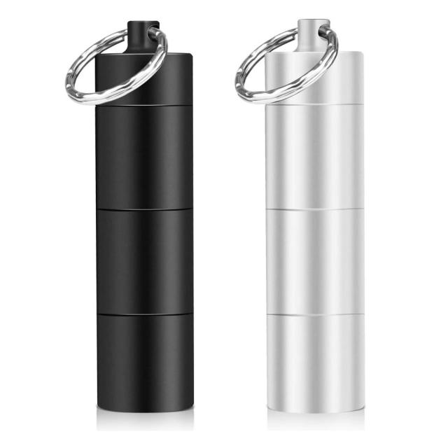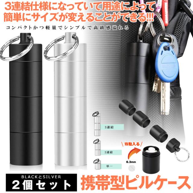 ピルケース 2個セット おしゃれ 防水 薬入れ 携帯型 サプリケース 持ち運び ネックレス キーリング アルミ合金 キーホルダー ブラック シルバー 2-RENPIL