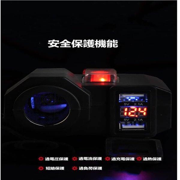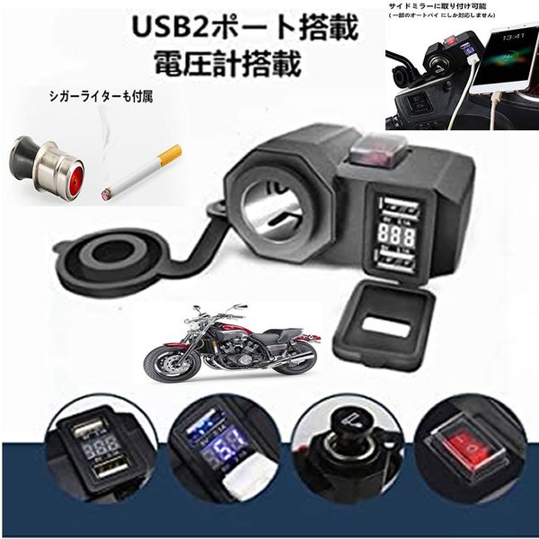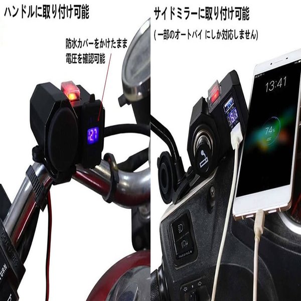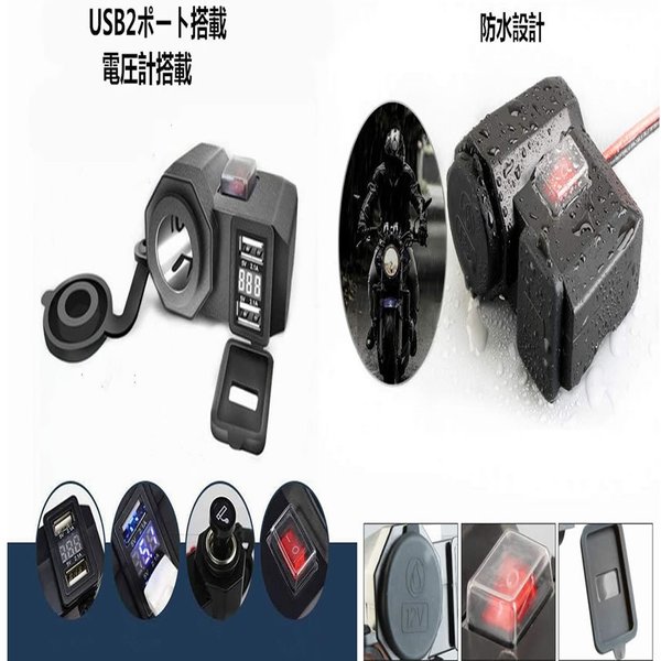 電圧計を搭載しており、バイクのバッテリー電圧やUSB電圧を一目で観測可能です ;電源スイッチ付きで、使用しない際はOFFにして電力を節約できます