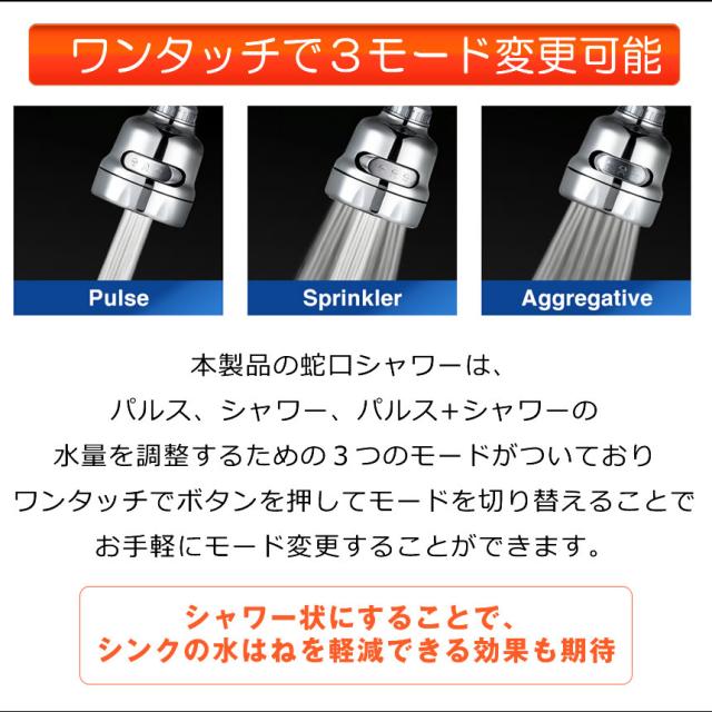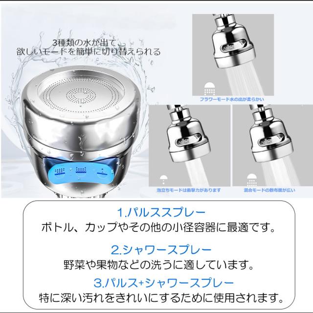 3段階モード:3段階モード(パルス/シャワー/パルス+シャワー)はボタンを左中右に押すと3種類の水流切り替え。(1)パルス ボトル、カップやその他の小径容器に最適です。(2)シャワー 野菜や果物などの洗うに適しています。(3)パルス+シャワー 特に深い汚れをきれいにするために使用されます。